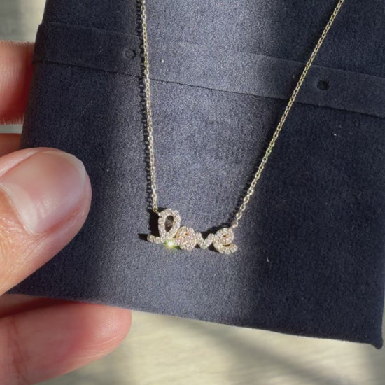 The Diamond Pave Love Necklace features the word "LOVE" creating immediate romantic expression. This universal word celebrates affection devotion and heartfelt connection. The script adorned with diamonds transforms simple sentiment into luxurious jewelry expressing profound feelings with sophisticated elegant meaningful romantic beautiful symbolic sentimental presence and cherished timeless romantic style perfect for expressing love devotion affection with refined elegant meaningful substantial romantic sentimental symbolic beautiful character celebrating love beautifully eloquently substantially through sparkling meaningful romantic word beautifully elegantly substantially.