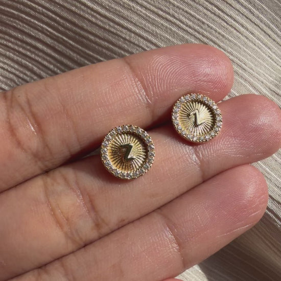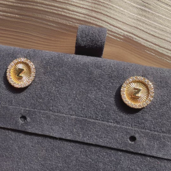 Diamond Halo Fluted Disc Earring with Gold Initial
