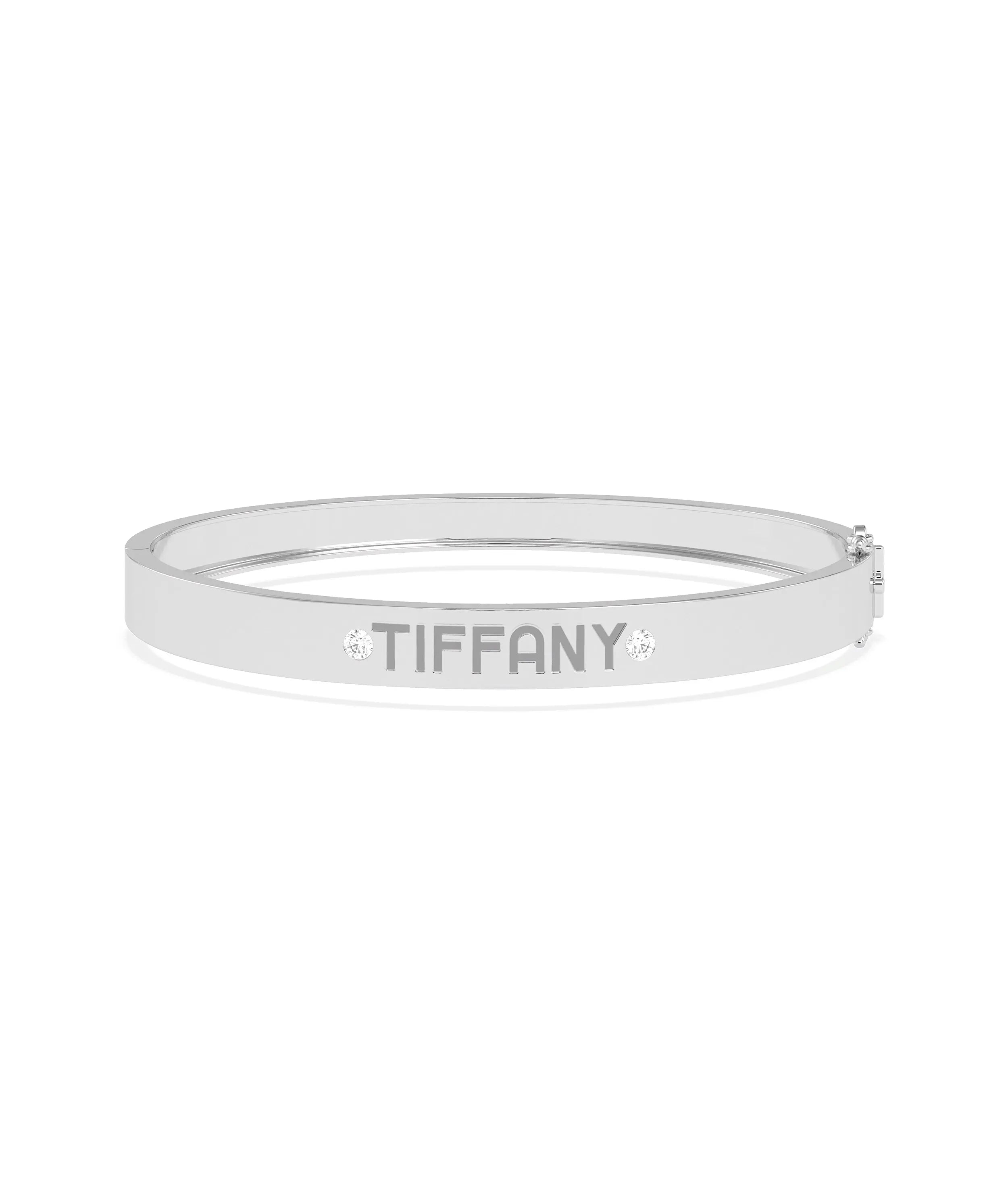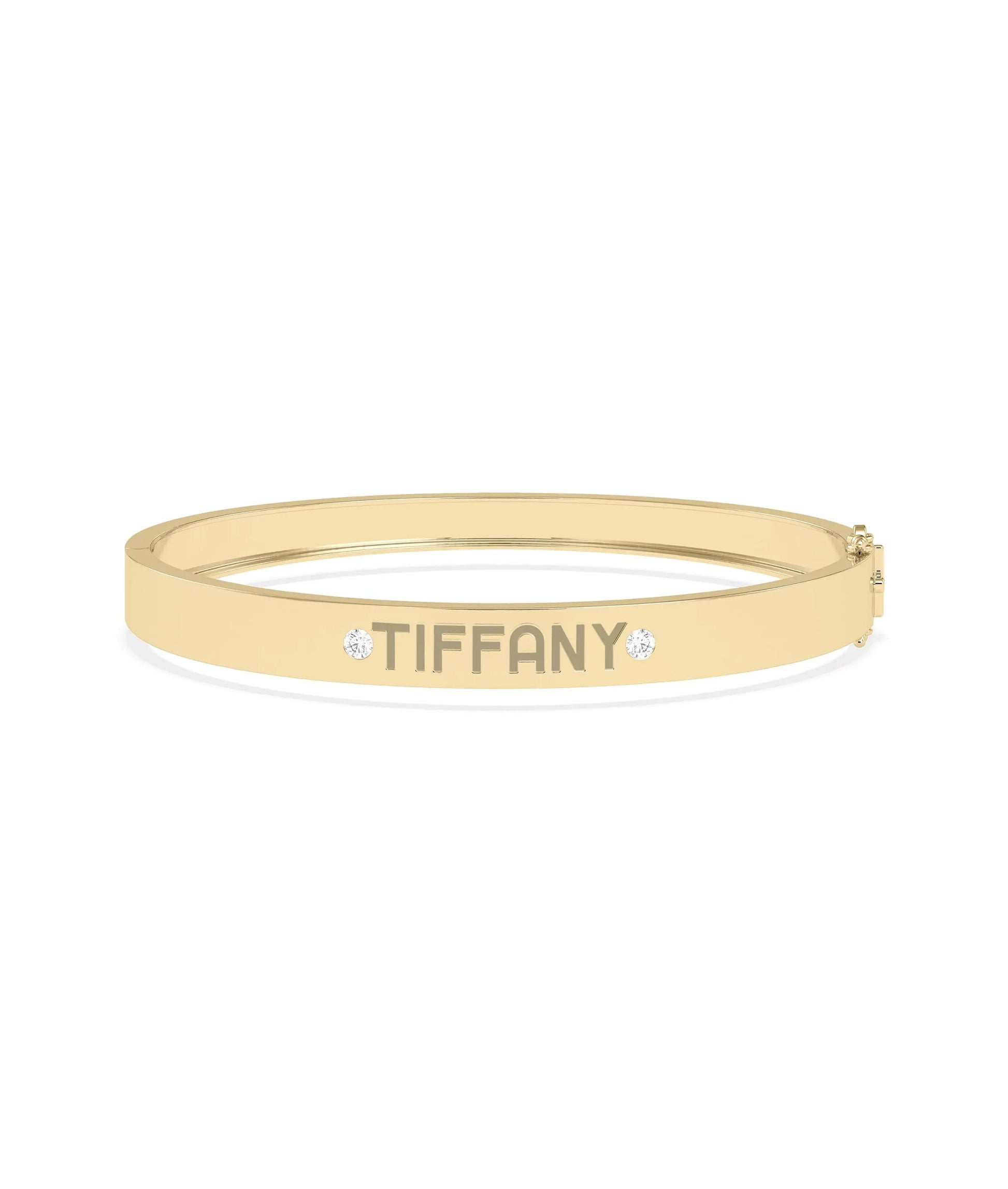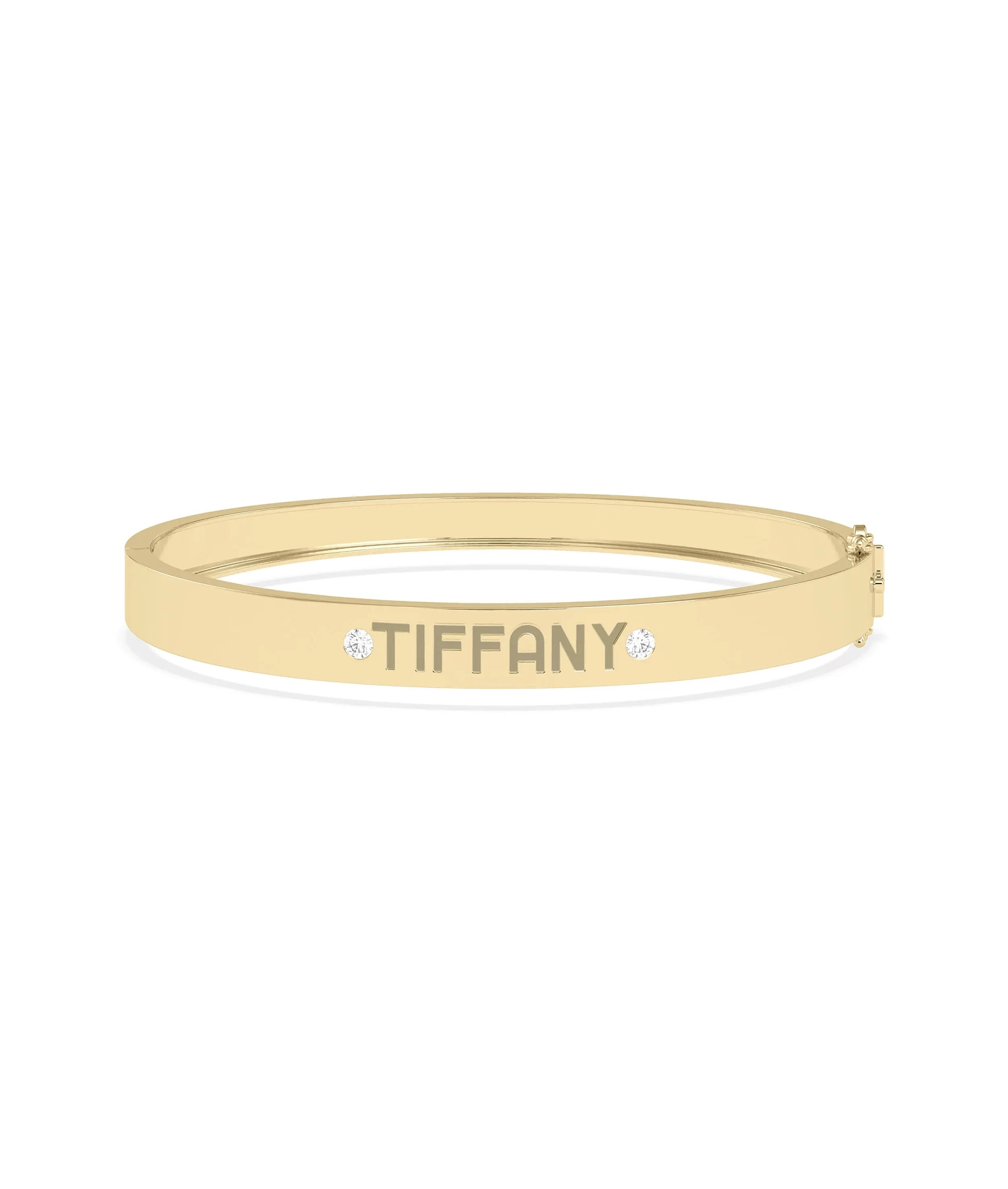 Discover our new personalized diamond bangle. Customize this diamond bangle for a unique style that reflects your individuality and elegance. Perfect for everyday jewelry. Our Personalized Diamond Bangle, the perfect addition to your jewelry collection. Add a touch of elegance and sophistication with your name beautifully crafted in diamonds. A timeless piece that you'll cherish for years to come. Order yours today!