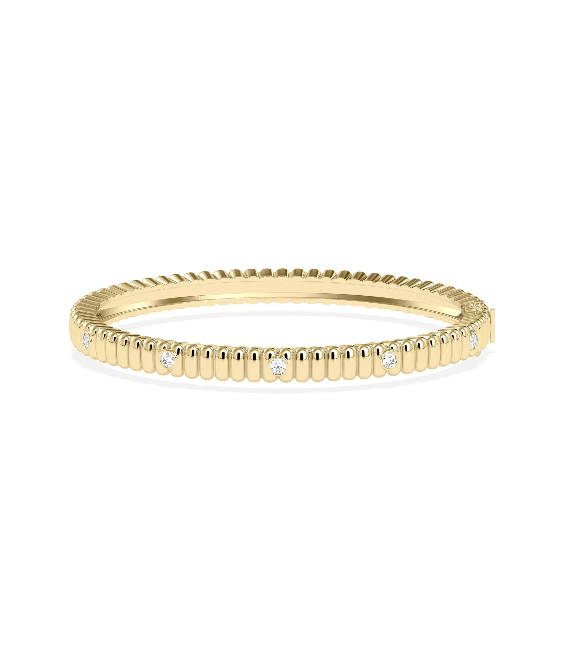 Discover elegance with our Diamond Station Fluted Bangle. Perfect for everyday jewelry, this diamond bangle combines chic design with timeless charm. A radiant diamond wrap for life's special moments. Introducing the Diamond Station Fluted Bangle! This stunning piece features sparkling diamond stations set in a Fluted design for a modern, yet timeless feel. Elevate any outfit with this must-have accessory.