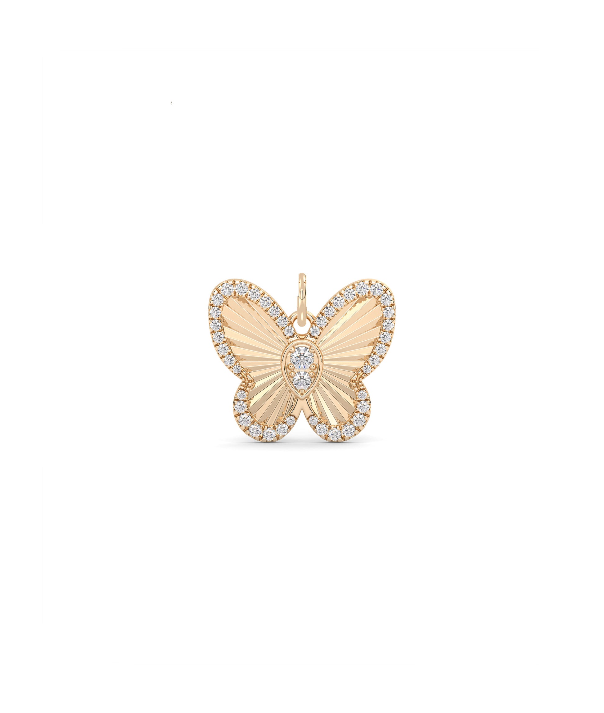 Introducing the Fluted Butterfly Charm, featuring mesmerizing fluted wing pattern and sparkling diamond accents that add elegant sparkle to any outfit, perfect for those appreciating intricate natural beauty and transformation symbolism.