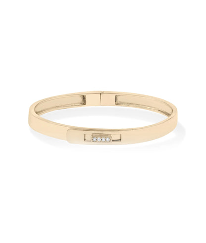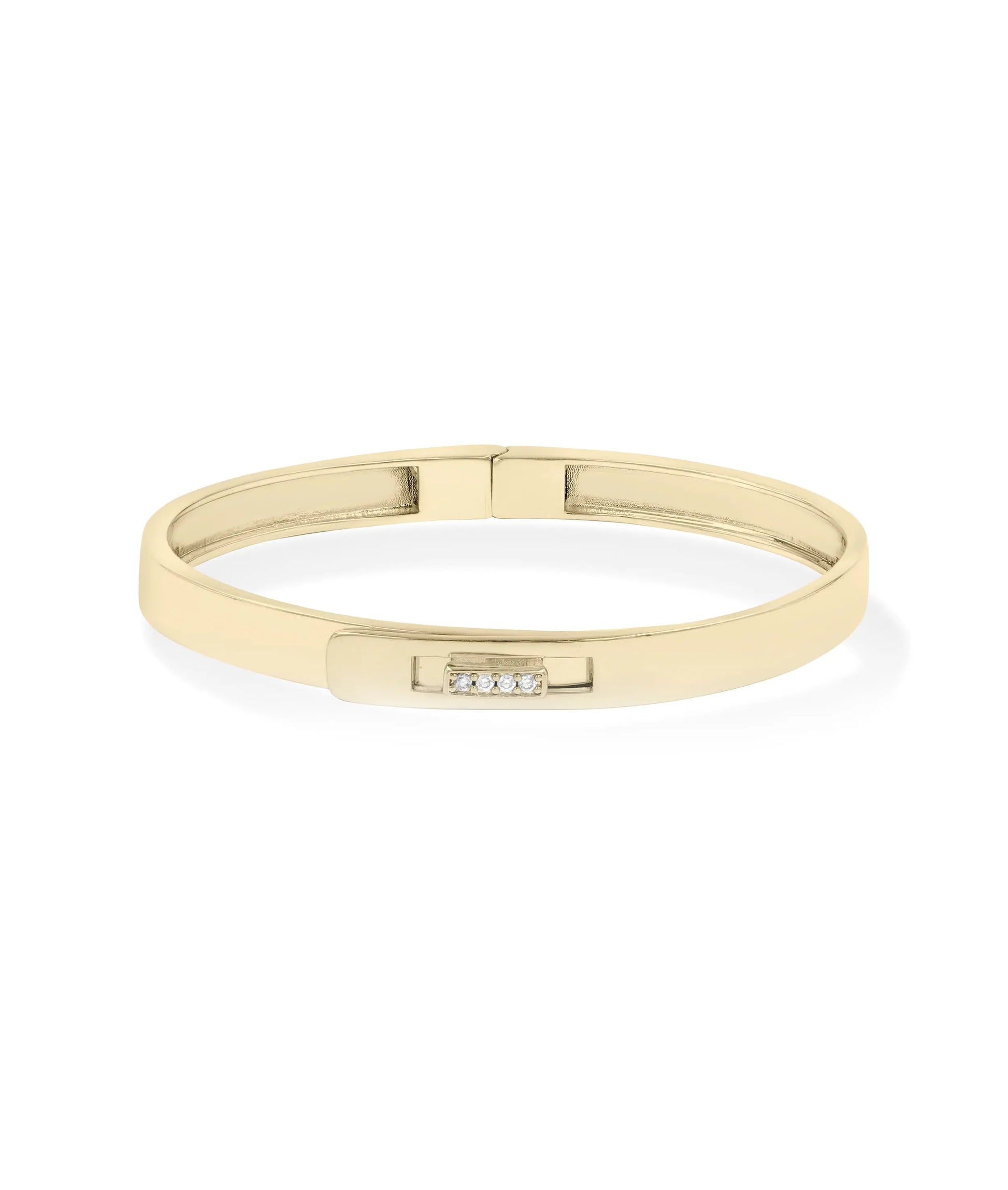 The Diamond Buckle Bangle features hardware-inspired buckle motif as its distinctive design element. This belt buckle-style detail creates contemporary edge and visual interest. The buckle becomes the bangle's focal point, bringing fashion-forward hardware aesthetic to fine jewelry.