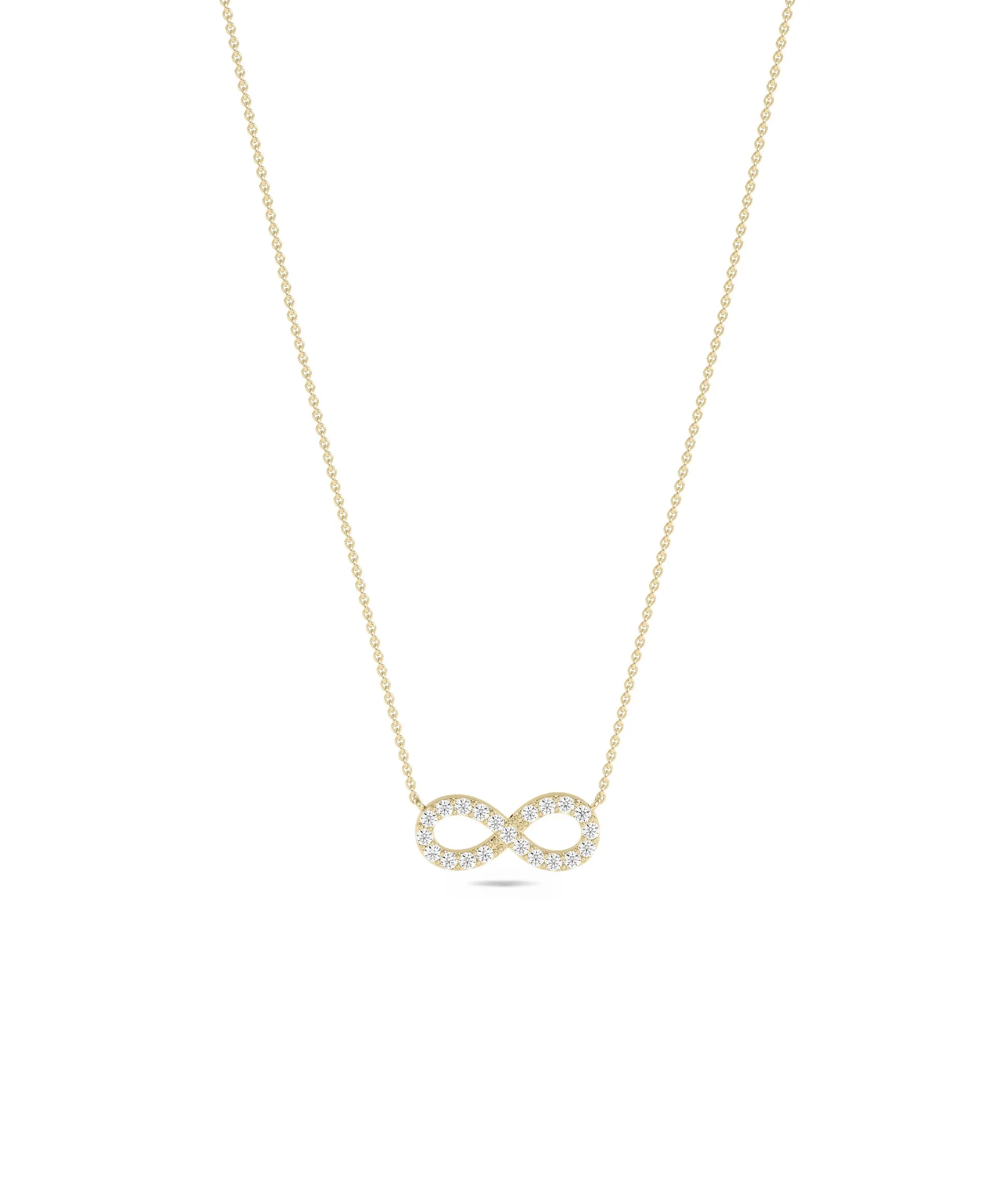The Diamond Infinity Necklace celebrates eternal connections with elegant sparkle. Featuring the iconic 13mm x 3.5mm infinity symbol adorned with diamonds in solid gold, this piece delivers timeless symbolism with sophisticated brilliance. The graceful figure-eight form enhanced by diamond embellishment creates distinctive jewelry expressing endless love and unbreakable bonds with dazzling refined elegant style and meaningful eternal presence perfect for celebrating lasting connections.