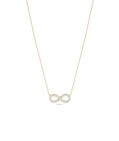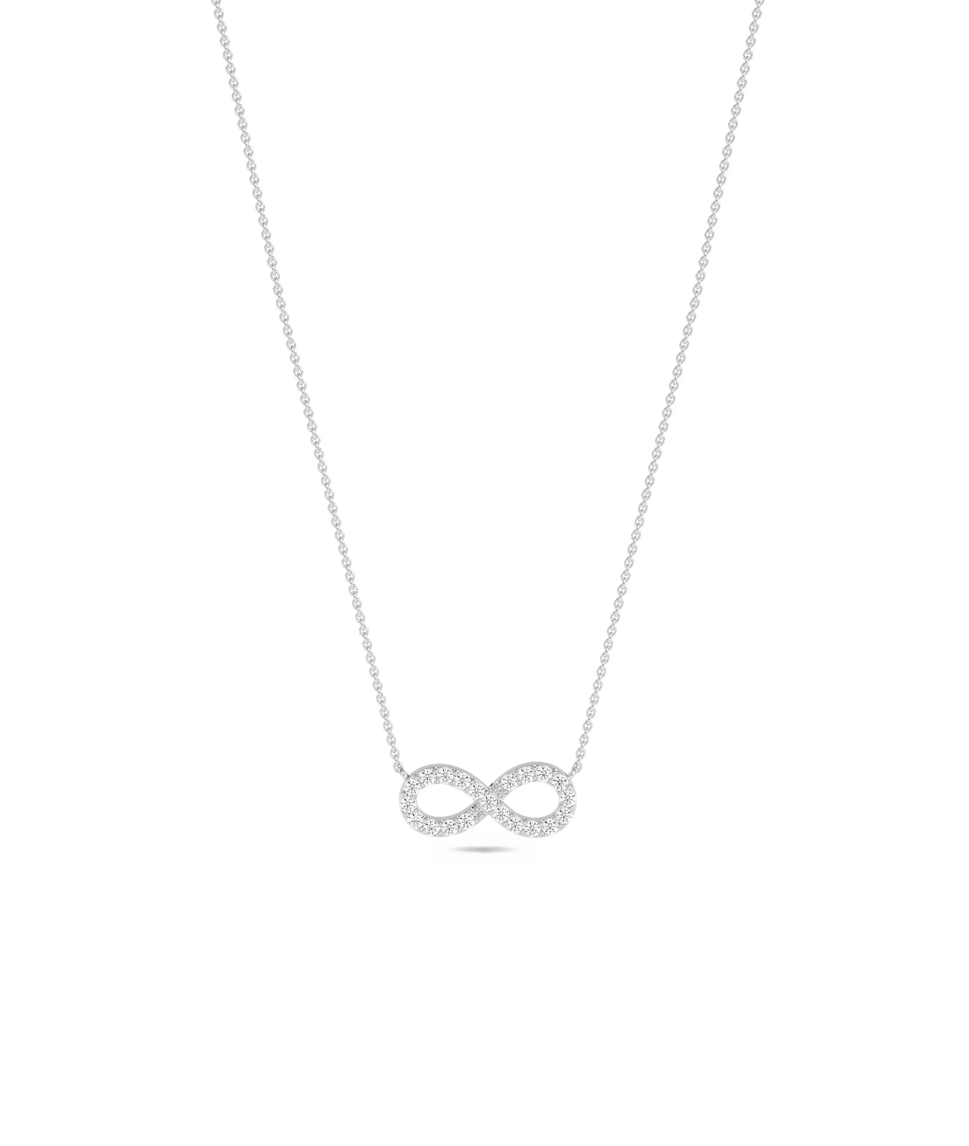 The diamonds embellish the Diamond Infinity Necklace adding elegant sparkle throughout the eternal symbol. Diamond placement enhances the flowing figure-eight form with refined brilliance. This sparkling embellishment elevates timeless symbol into luxurious jewelry where infinity receives elegant diamond treatment with sophisticated radiant beauty and quality refined sparkle creating necklace where endless love literally sparkles with dazzling delicate brilliance.