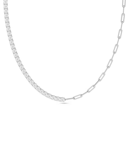 The Diamond Tennis Paper Clip Necklace uniquely combines classic tennis necklace sparkle with trendy paper clip chain styling. This fusion creates contemporary take on traditional diamond necklace, offering modern aesthetic with timeless brilliance. The combination of 5.50 carats with elongated links creates distinctive jewelry that's both current and elegant with sophisticated unique style.