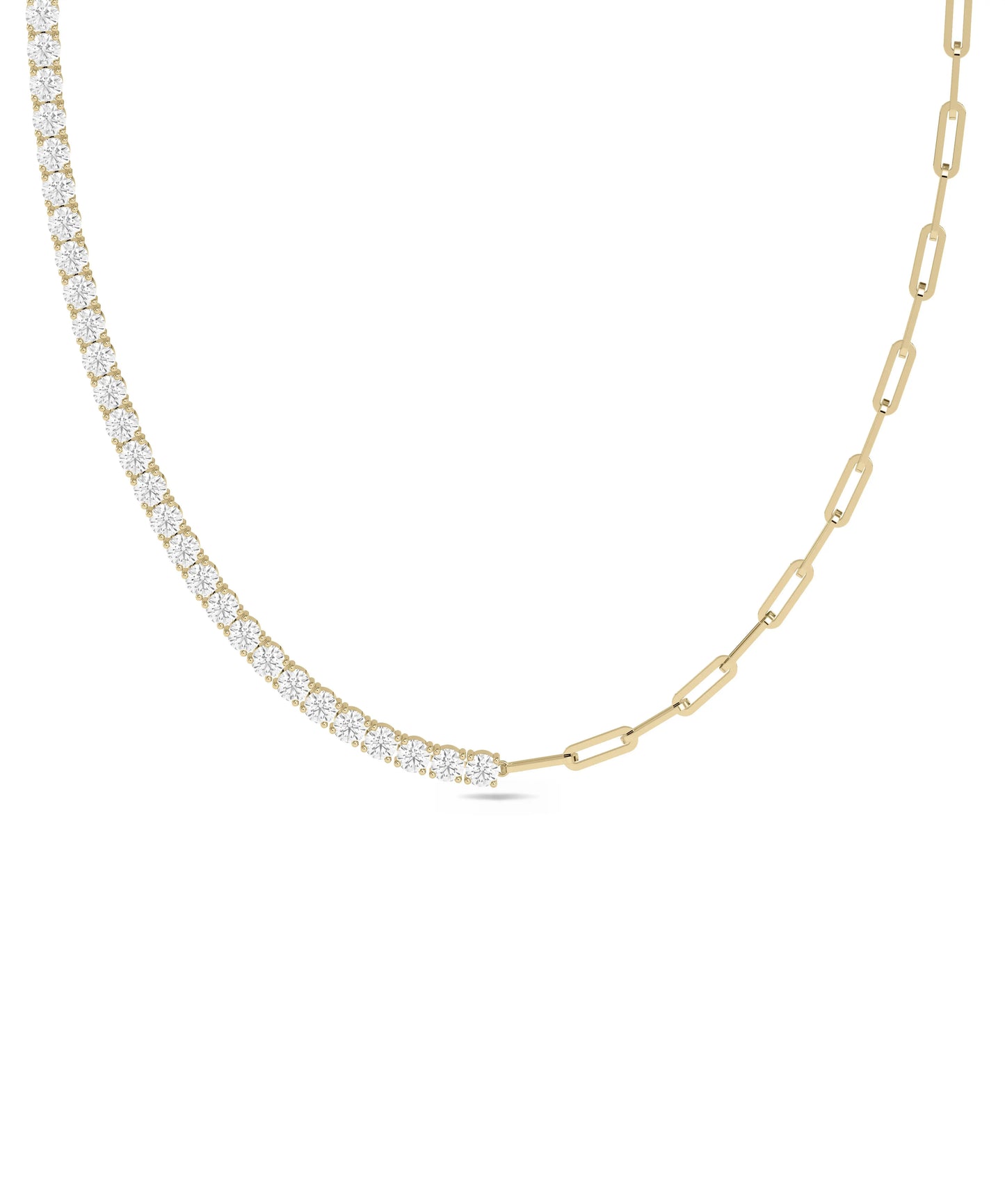 Tennis necklaces feature continuous line of individually set diamonds creating uninterrupted sparkle. The Diamond Tennis Paper Clip Necklace combines this classic tennis concept with modern paper clip links. Each link contains diamonds producing continuous brilliant shimmer throughout the entire necklace with luxurious impressive sparkle and sophisticated tennis-style radiance.