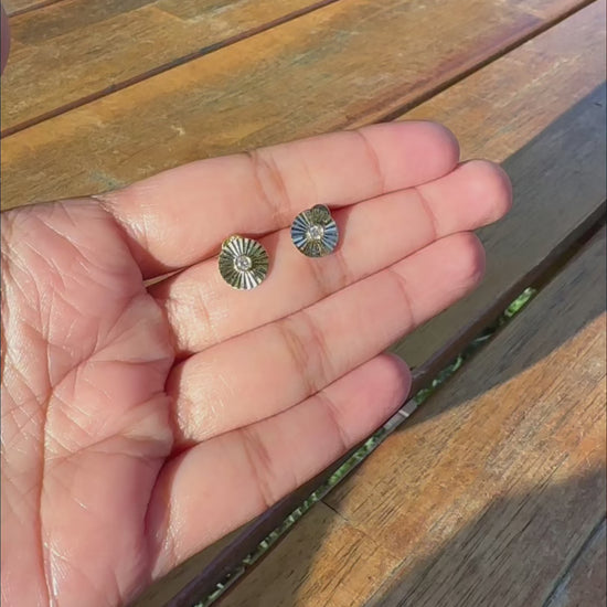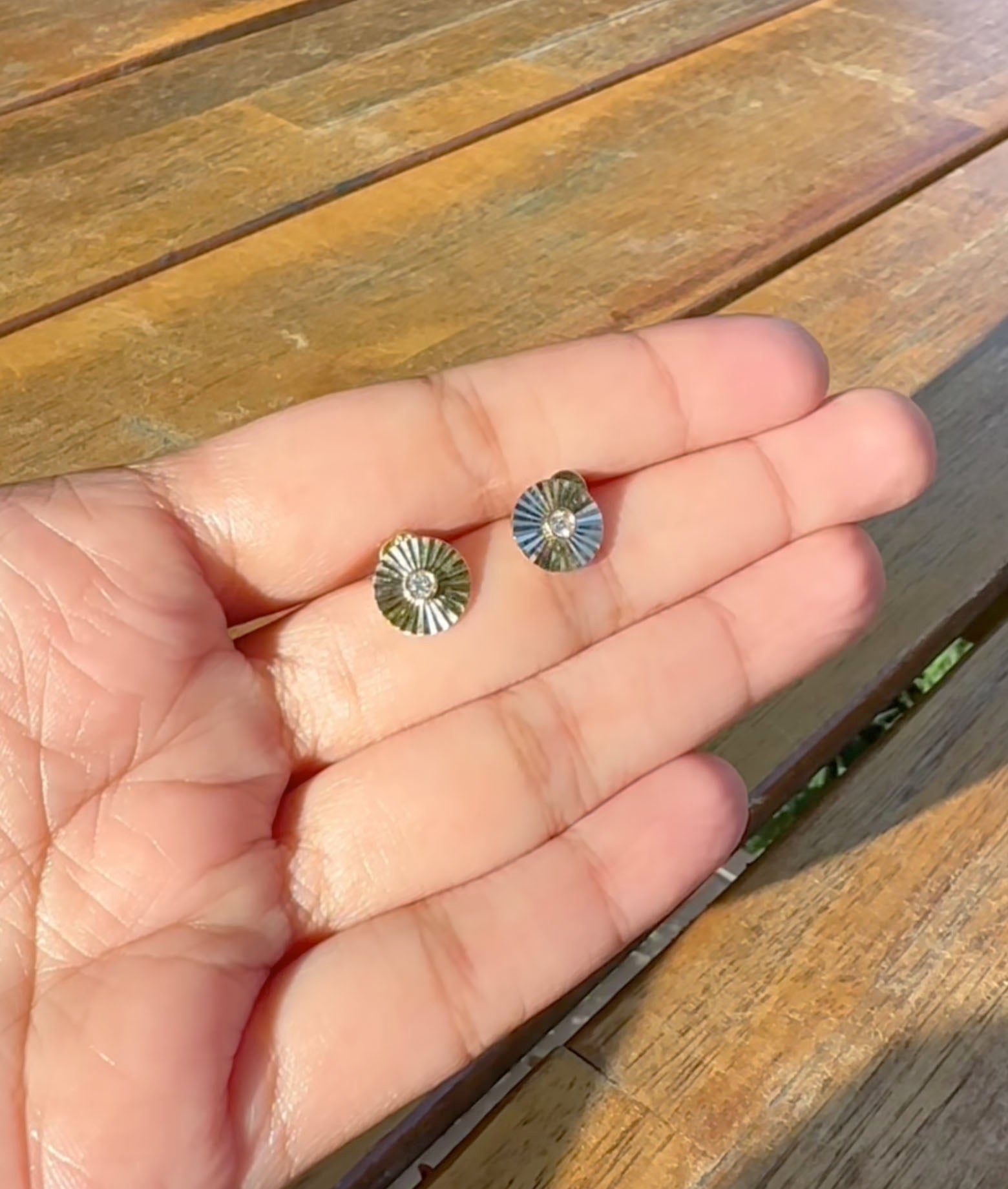 The combination of textured disc and sparkling solitaire creates multi-dimensional appeal. The fluting adds tactile and visual depth while the diamond provides brilliant focal point. This layered approach produces earrings more engaging than single-element designs.