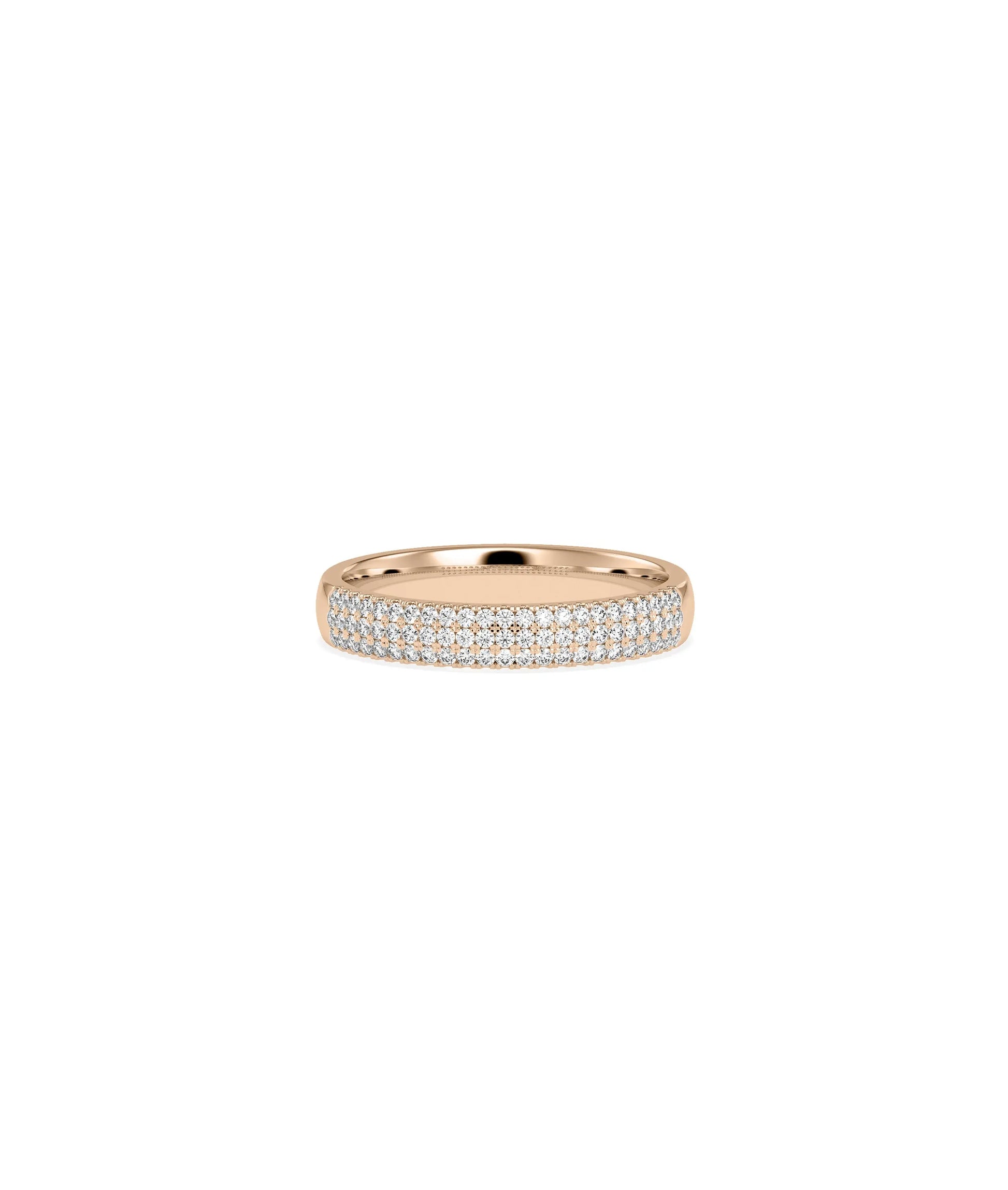 The 3 Row Diamond Pave Band Ring features three parallel rows of pave-set diamonds, creating tripled sparkle and enhanced visual impact. This multi-row design produces more brilliant light reflection than single or double rows, offering increased luxury with impressive presence perfect for those wanting maximum diamond coverage and spectacular, amplified radiance.