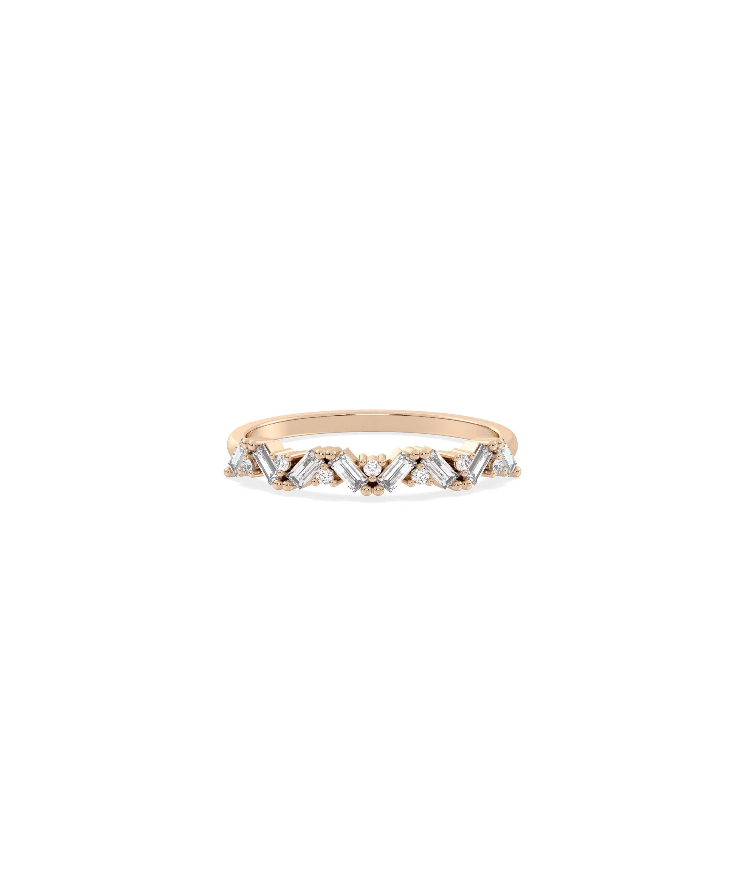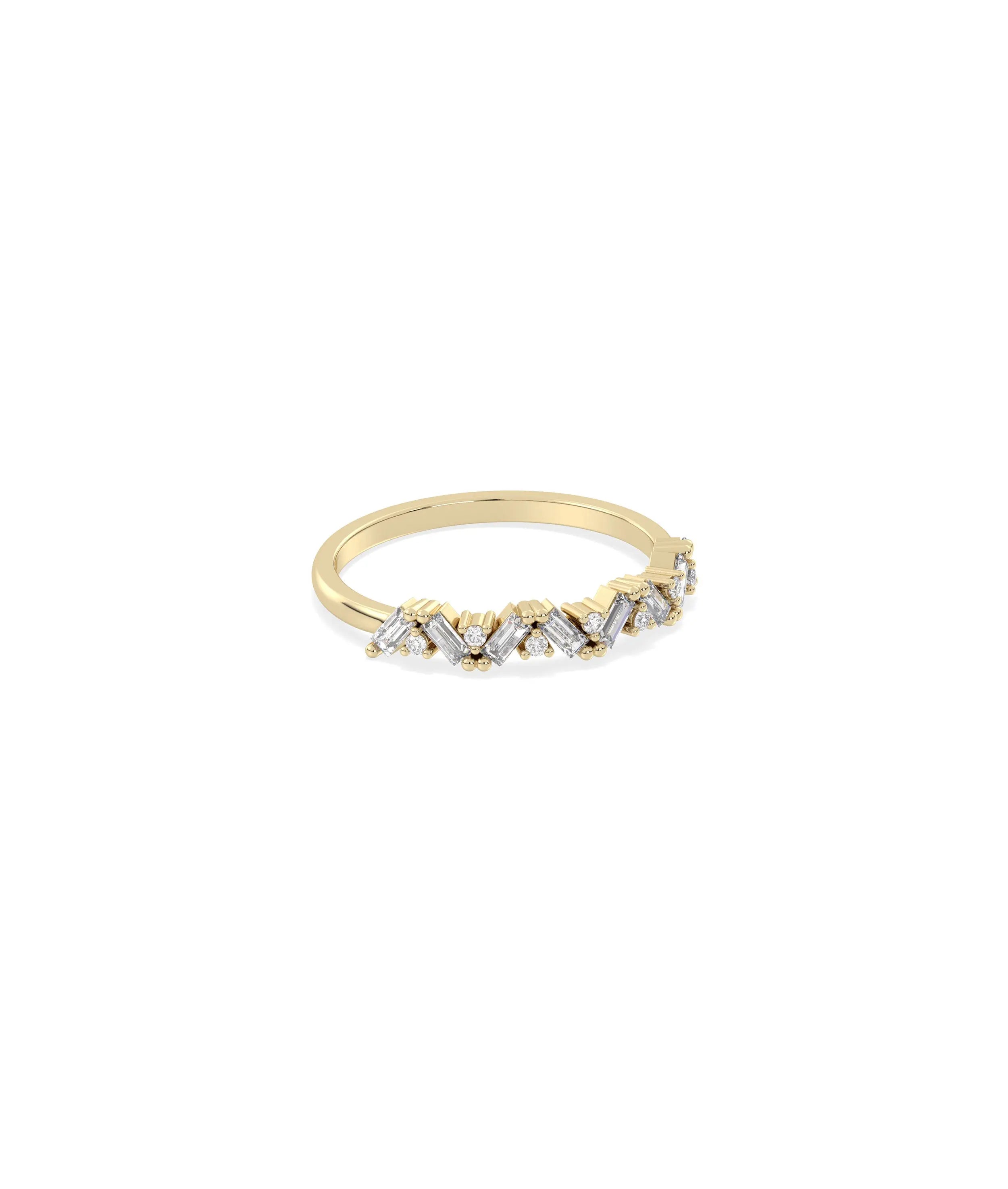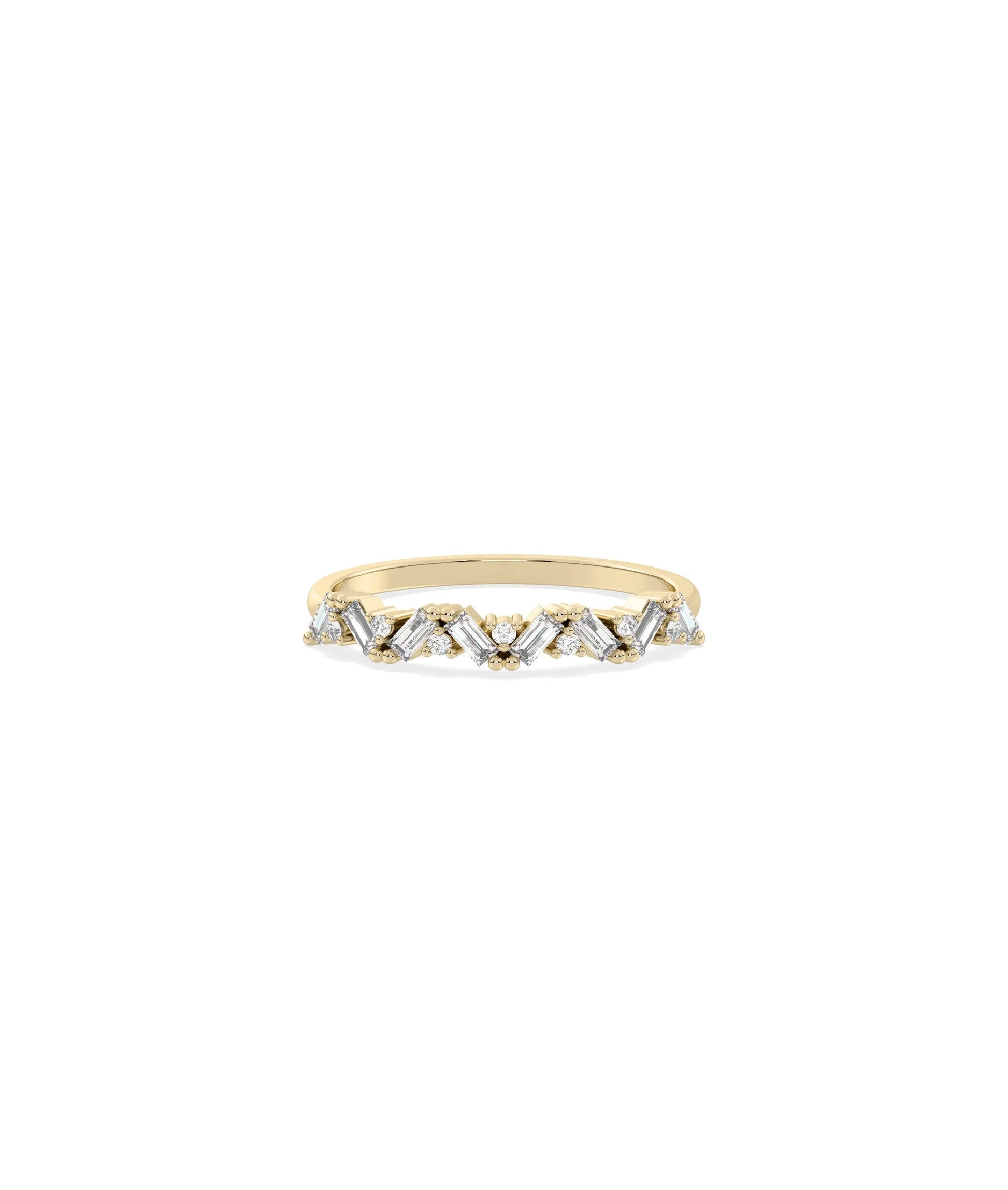 Absolutely. The thin 1.6 mm profile makes this ring ideal for creating layered looks. The mixed-shape clusters add textural interest to ring stacks, providing dimension and sparkle when paired with simpler bands or engagement rings.