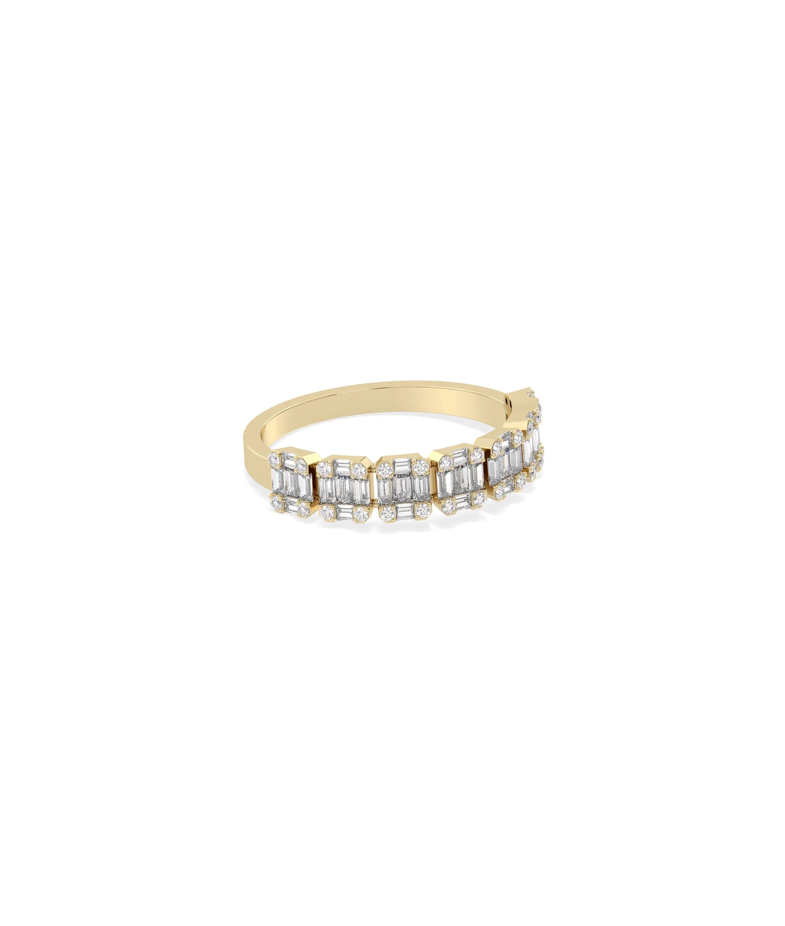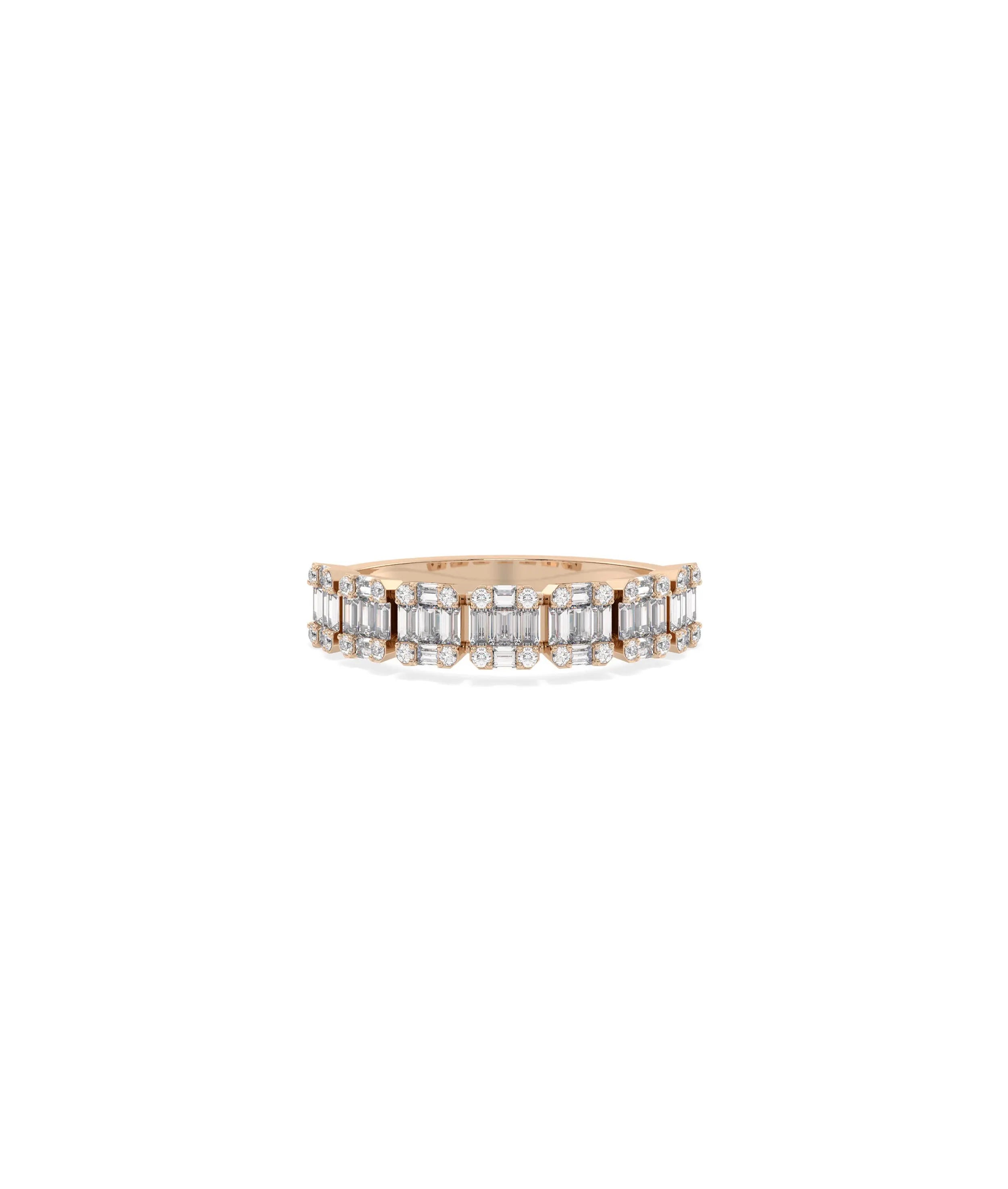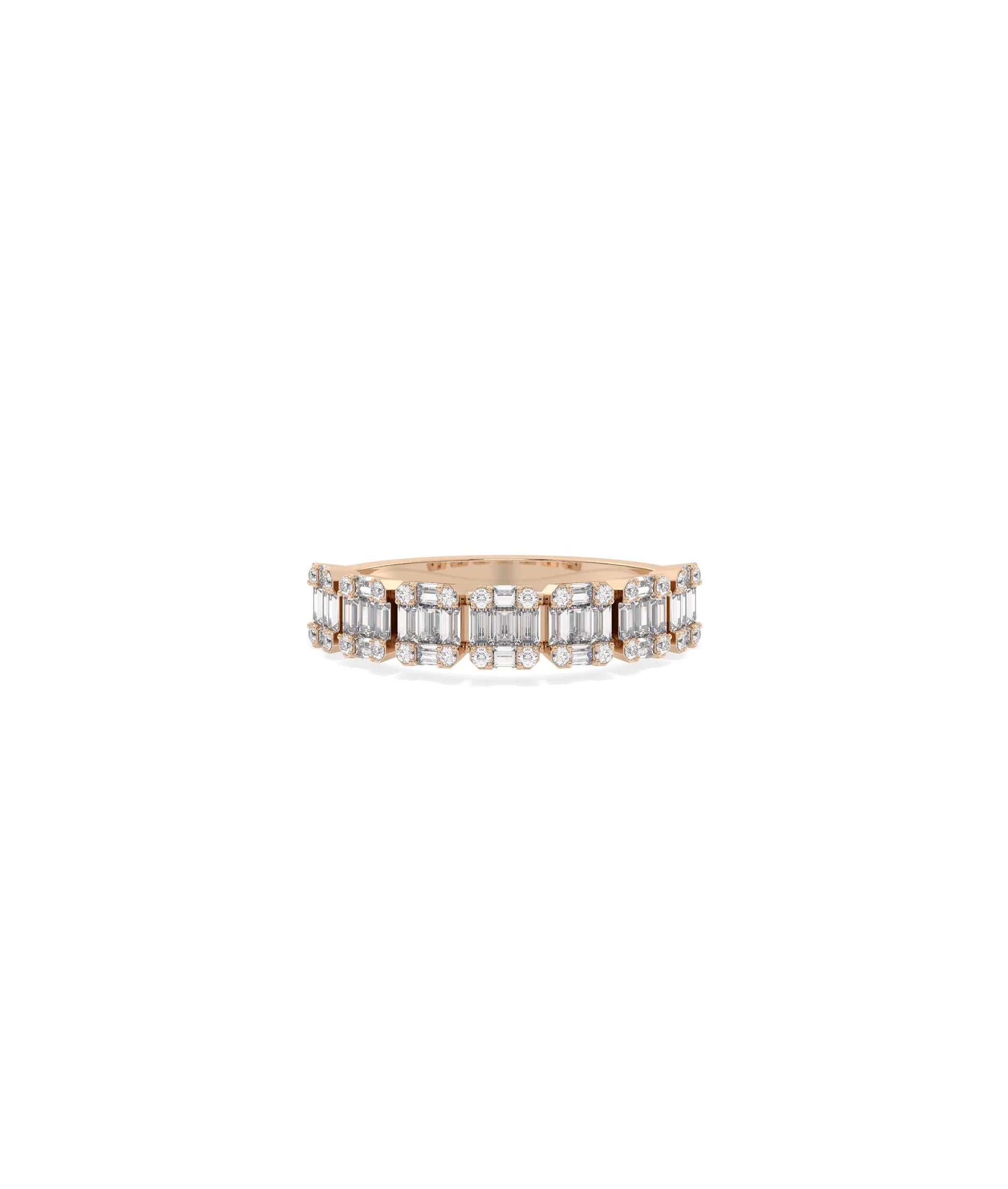 The reflective metal framework around each diamond reflects light, creating the illusion of larger stones with enhanced brilliance. In the Diamond Illusion Set Band Ring, this clever technique maximizes visual impact and sparkle dramatically.