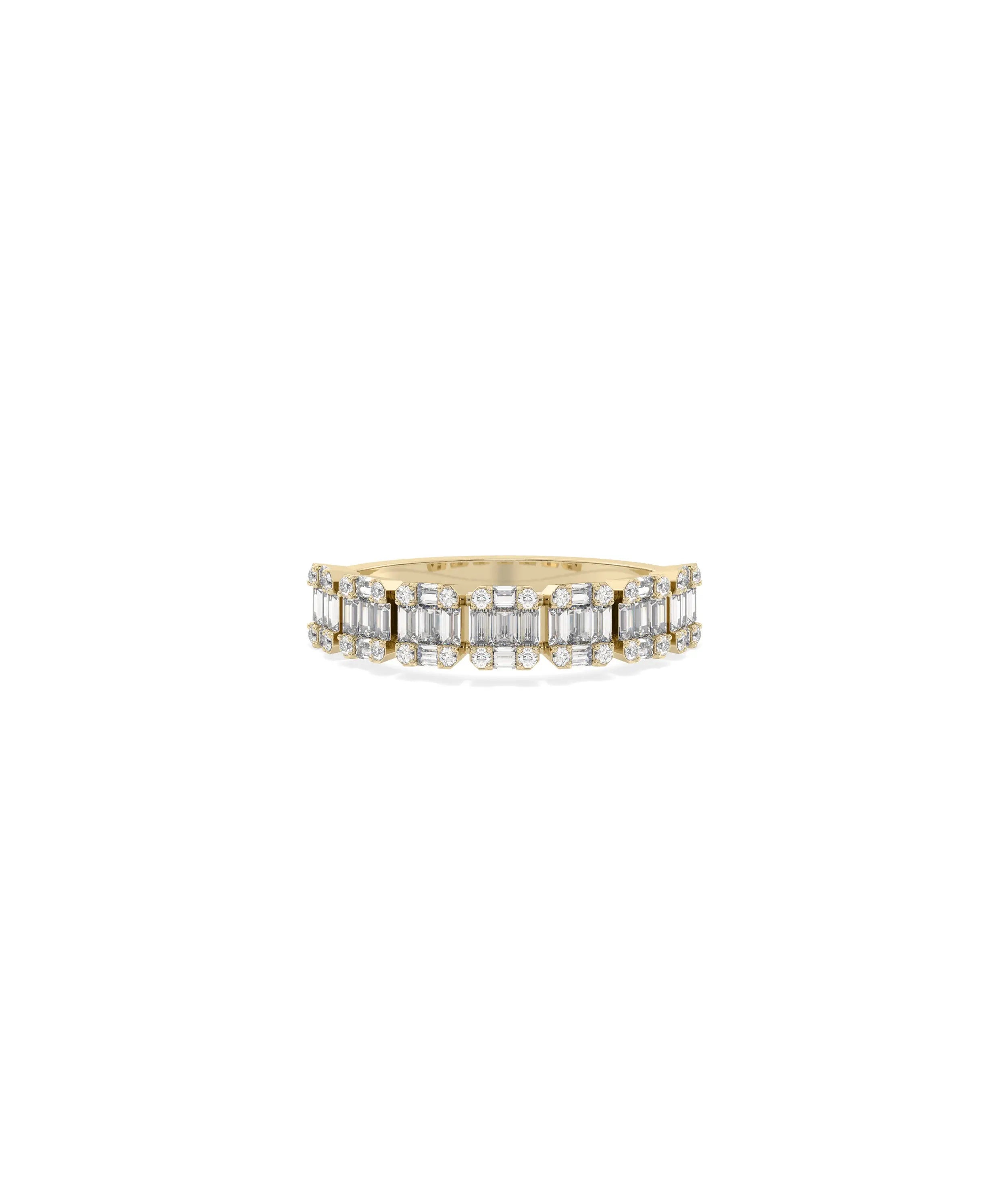 The illusion setting dramatically amplifies brilliance by reflecting light through the metal framework. The Diamond Illusion Set Band Ring creates exceptional sparkle that appears larger and more dazzling than the actual diamond sizes suggest.