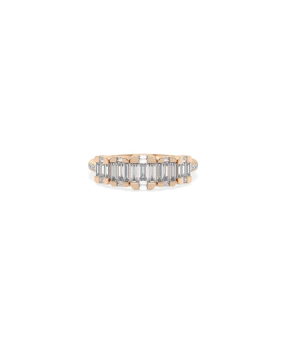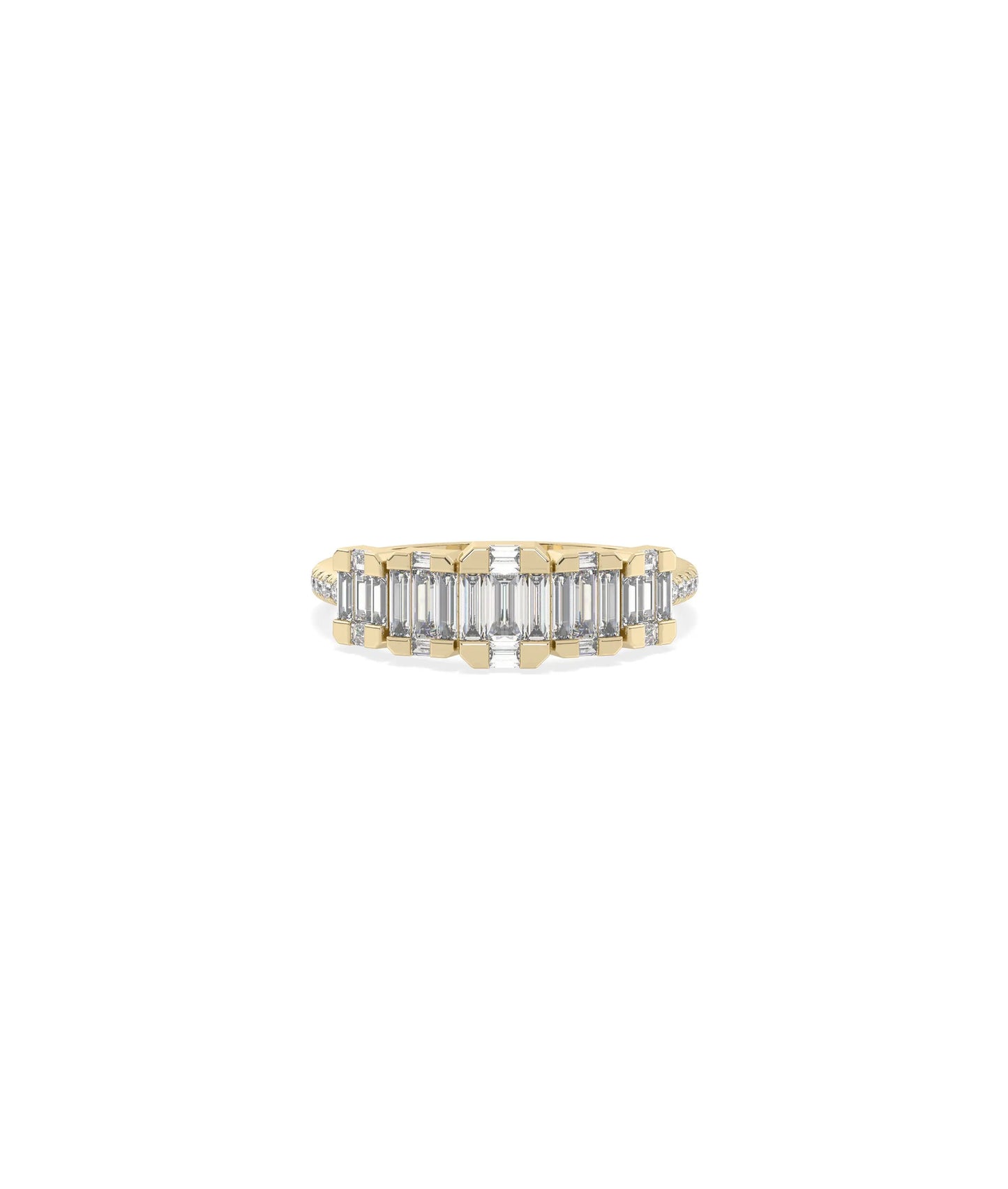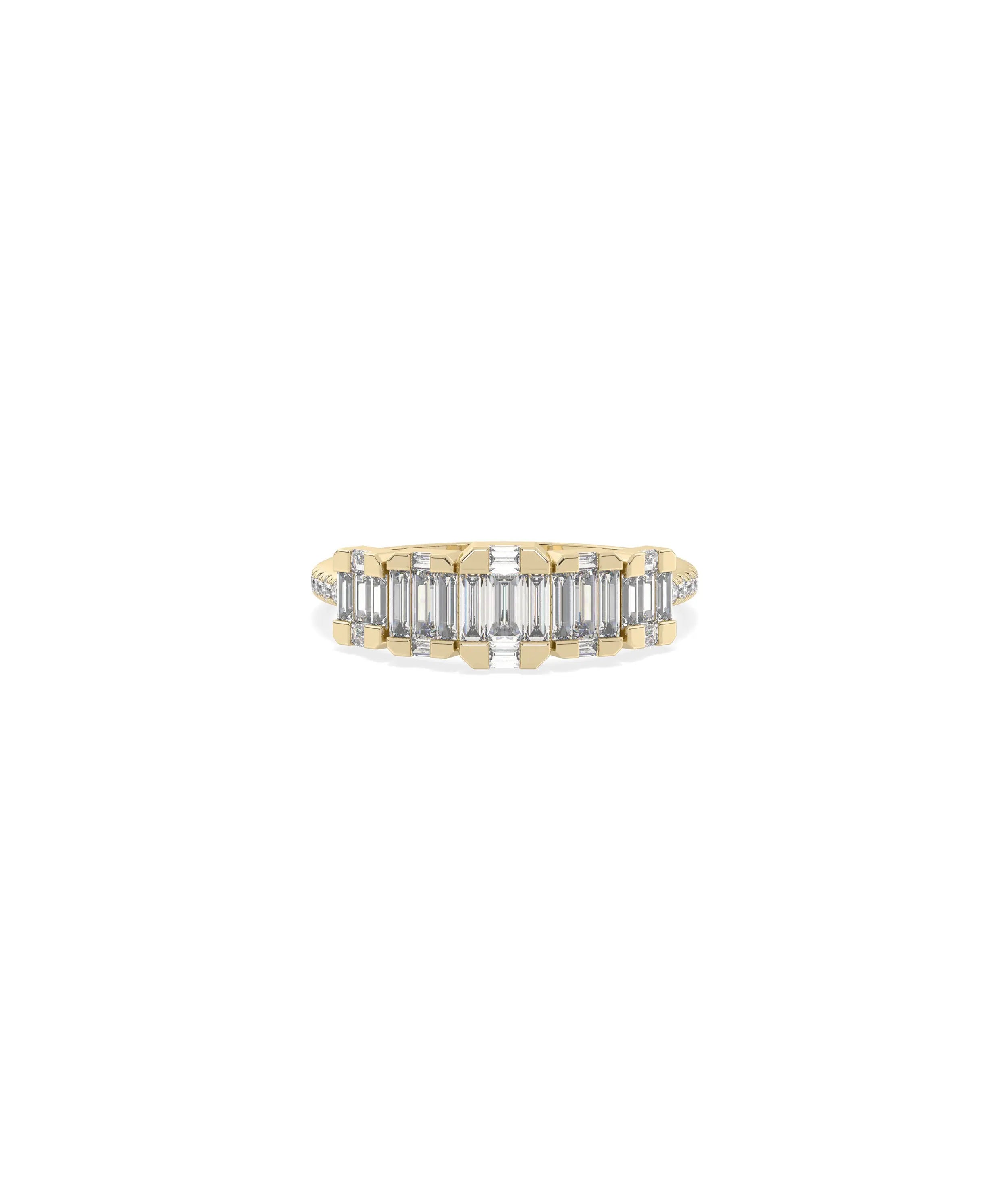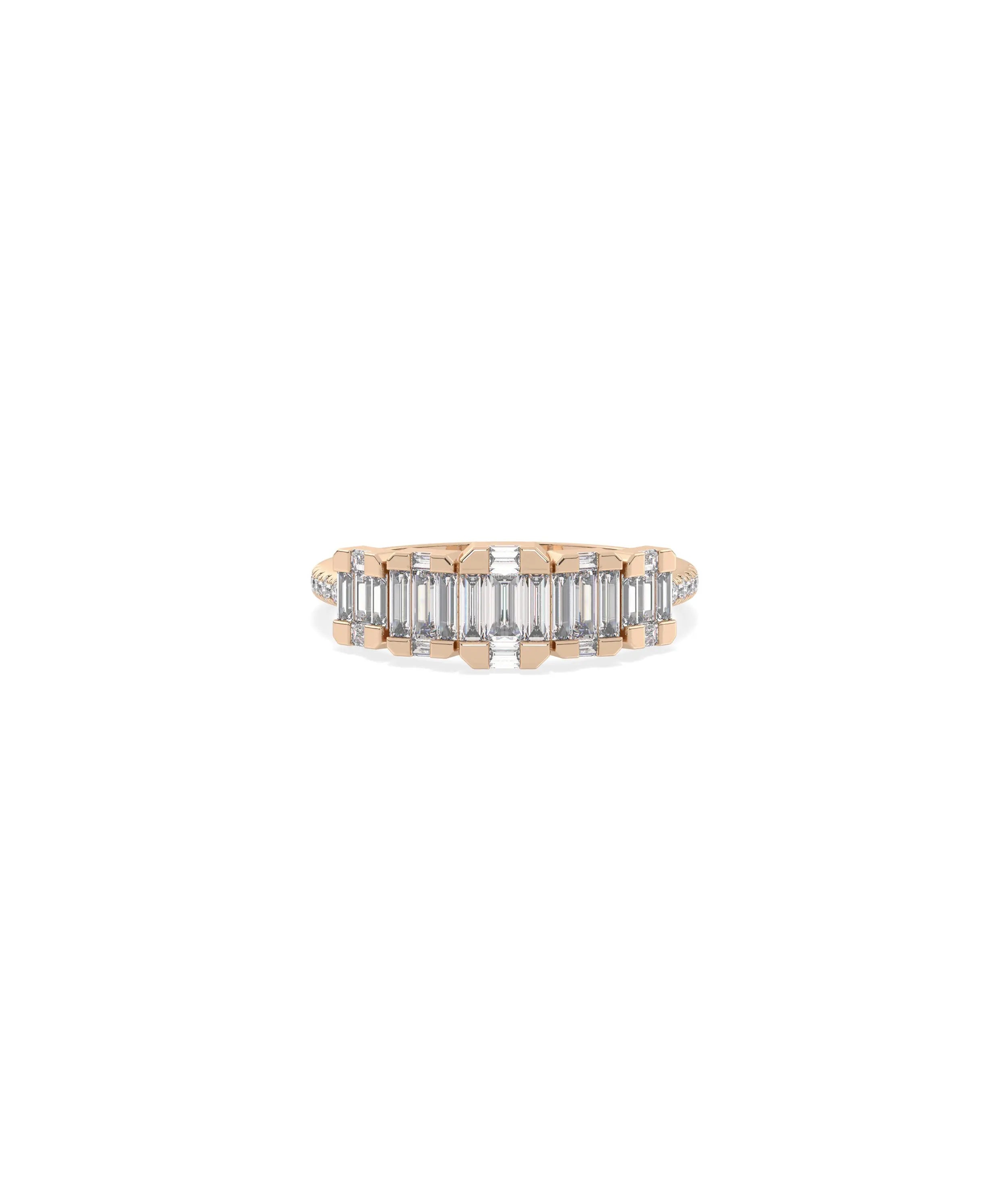 Combining 0.07 carats of brilliant round diamonds with 0.85 carats of sleek baguette diamonds, this Diamond Illusion Set Band Ring creates dynamic visual interest. The contrast between circular rounds and linear step-cut baguettes offers varied sparkle patterns enhanced by illusion settings throughout.