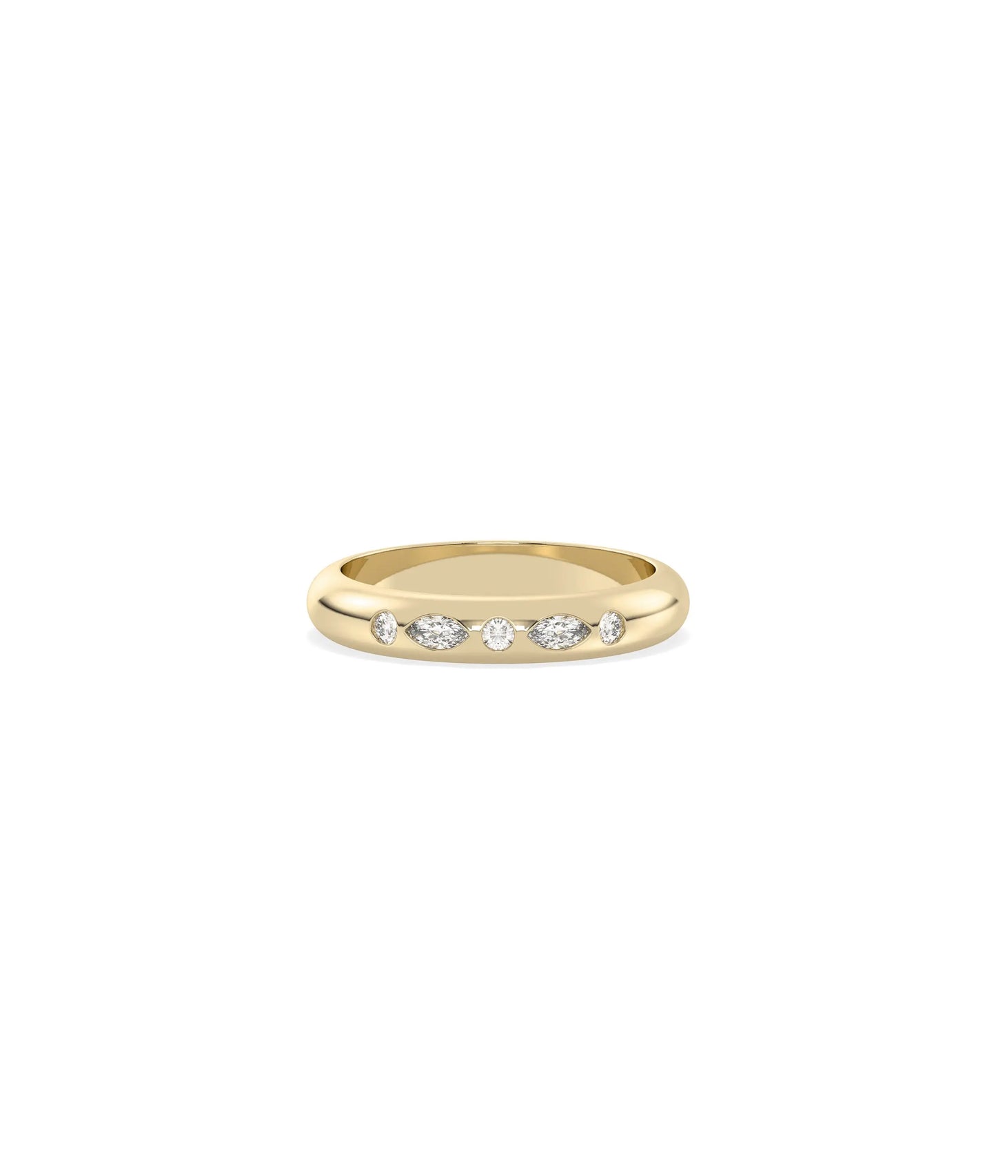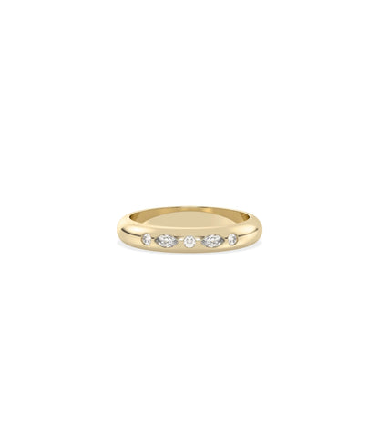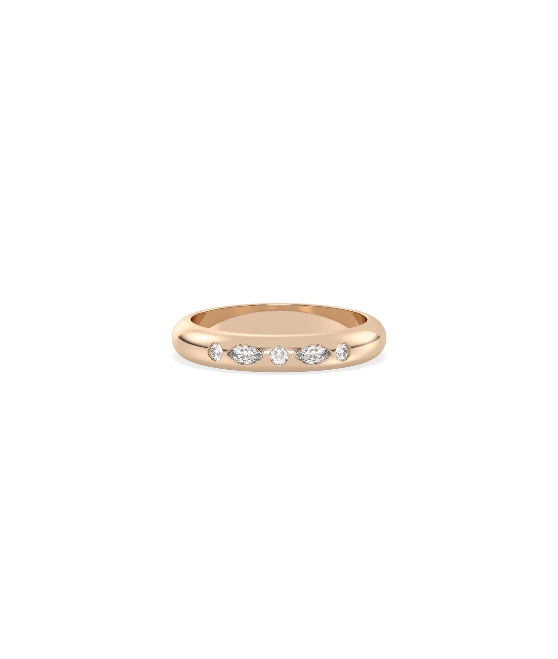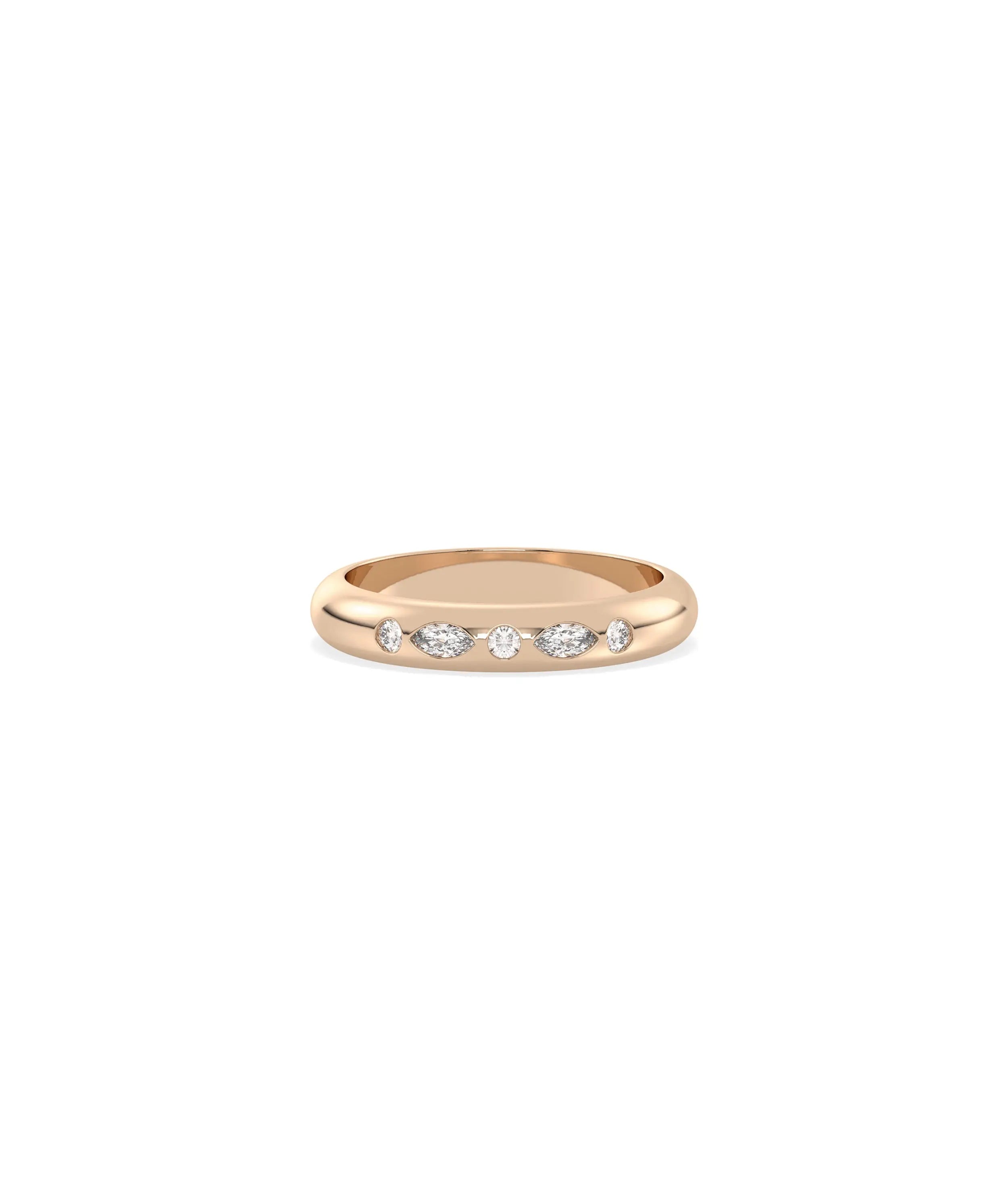 The Multi Shape Bezel Band Ring features various diamond cuts including round, oval, pear, or marquise, each individually framed in protective bezel settings. This design combines the visual interest of mixed shapes with the sleek, modern security of bezel mounting for contemporary elegance and geometric appeal.