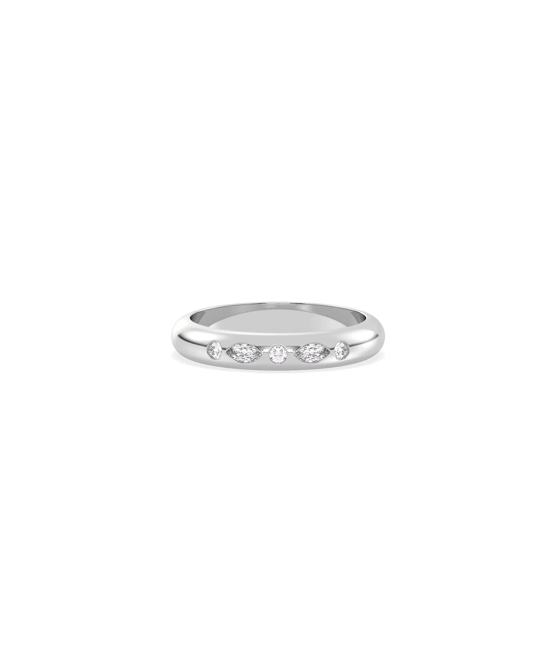 The Multi Shape Bezel Band Ring showcases various diamond cuts arranged in artistic harmony. This combination of shapes creates dynamic sparkle as different faceting styles reflect light uniquely, offering more visual interest and geometric appeal than uniform single-shape bands with contemporary sophistication.