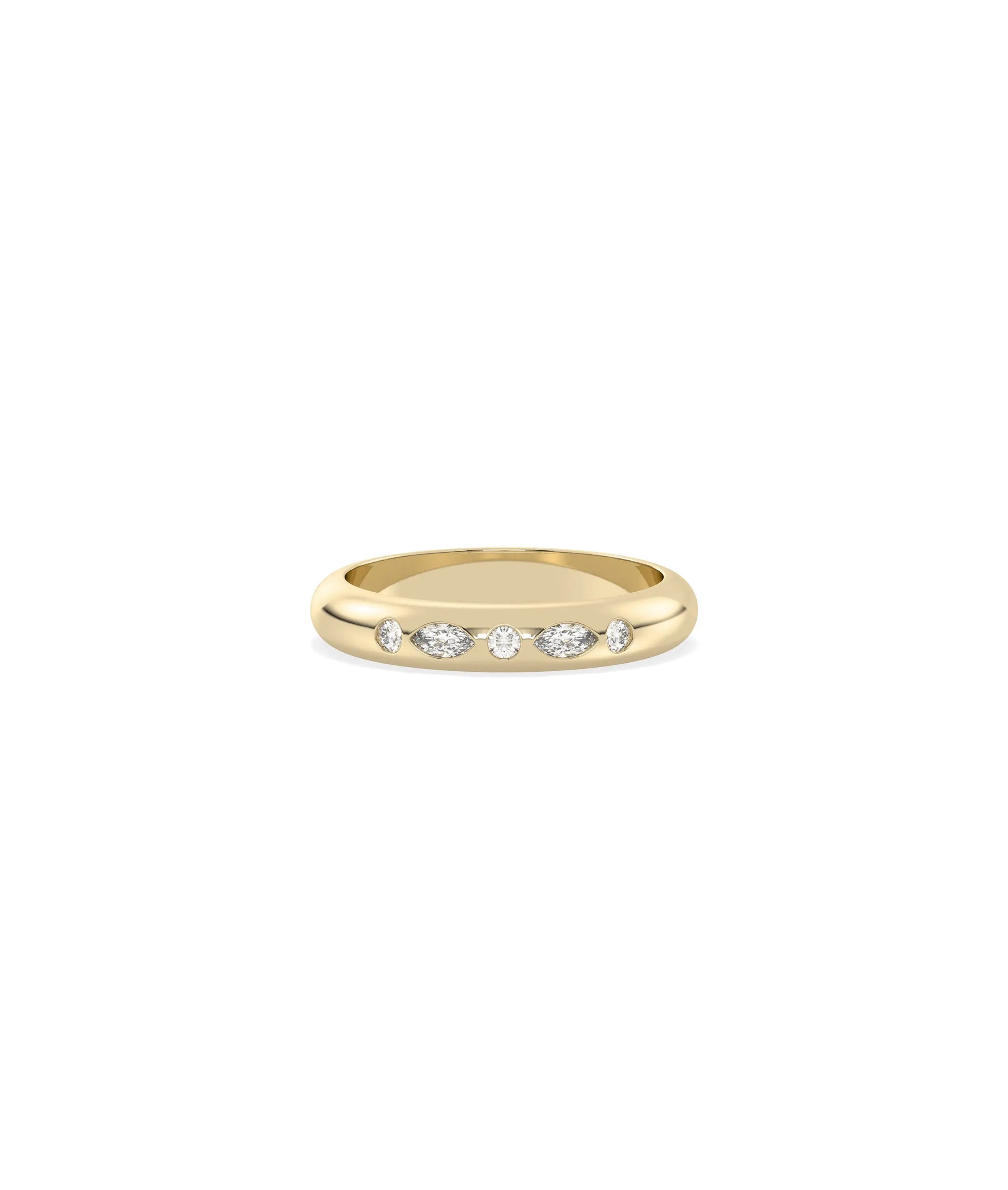 Crafted from 14K solid gold, this Multi Shape Bezel Band Ring demonstrates expert workmanship. Creating individual bezels for various diamond shapes requires exceptional skill to ensure proper fit and security for each cut, while the smooth finish ensures comfortable wear and lasting beauty.