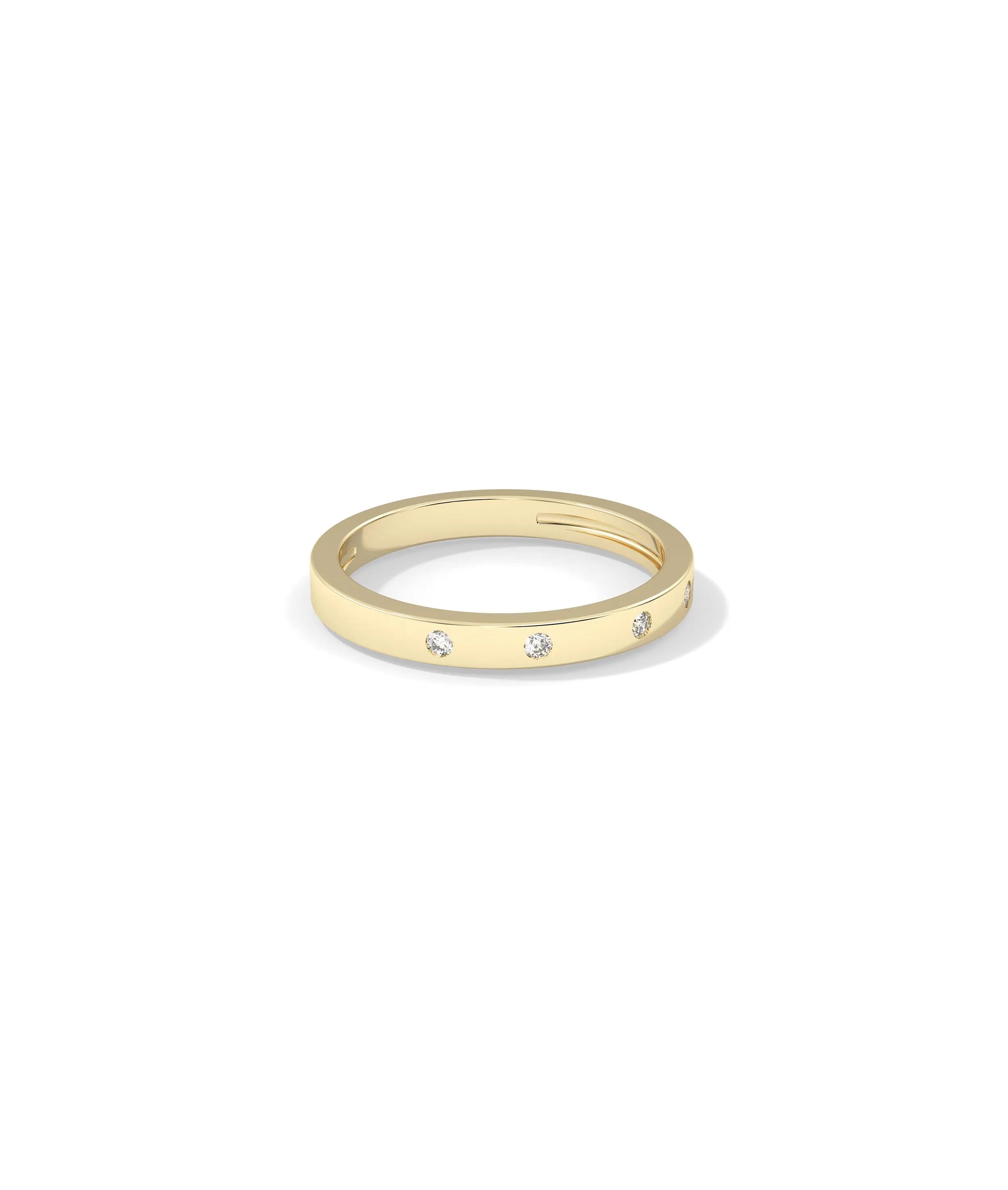 Yes, the 2.50mm width and smooth bezel settings make this ring excellent for stacking with engagement rings or other bands. The station design adds interesting texture when layered while the flush bezel surfaces sit comfortably against adjacent rings without gaps, allowing seamless, elegant stacking with comfortable versatility.