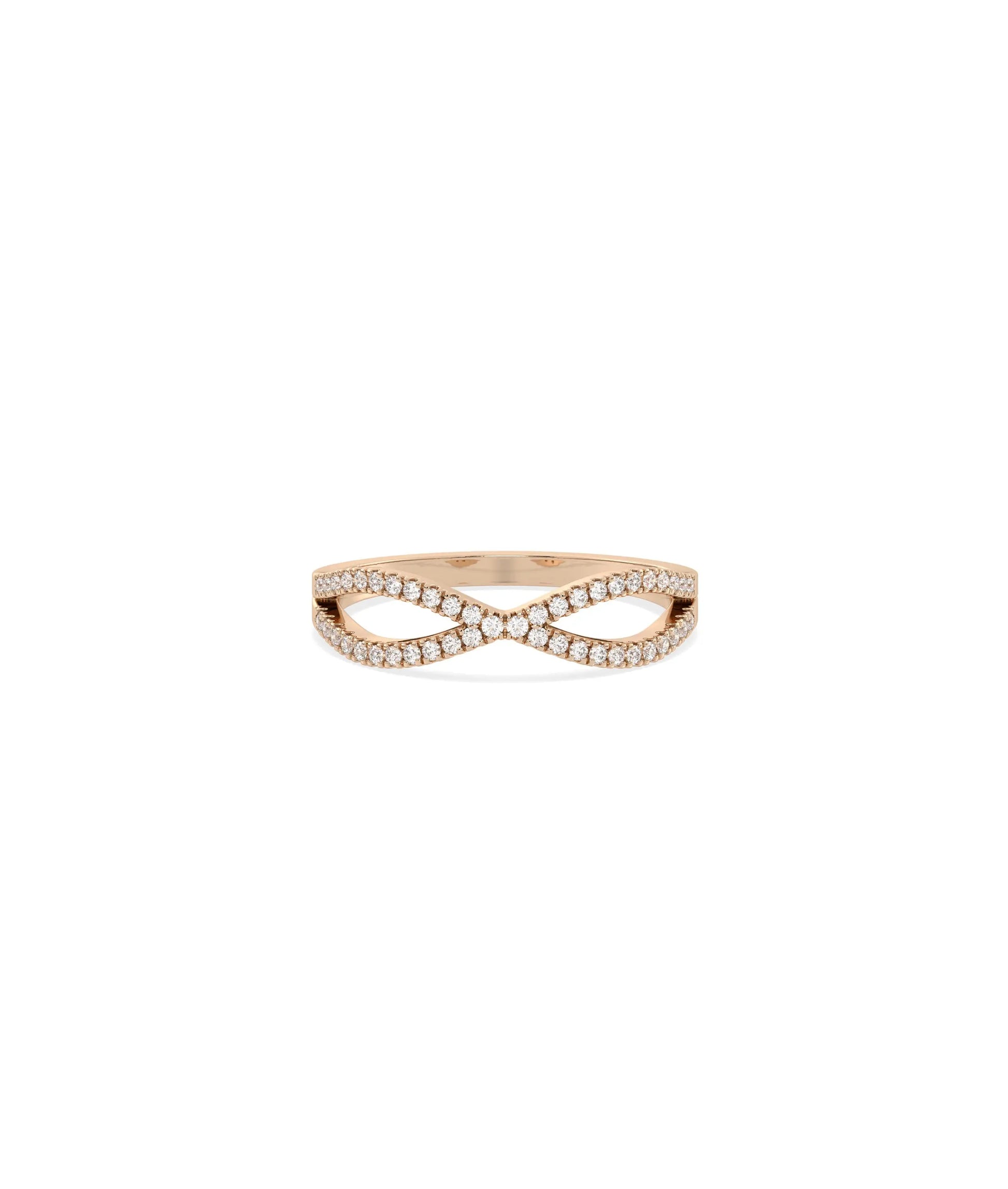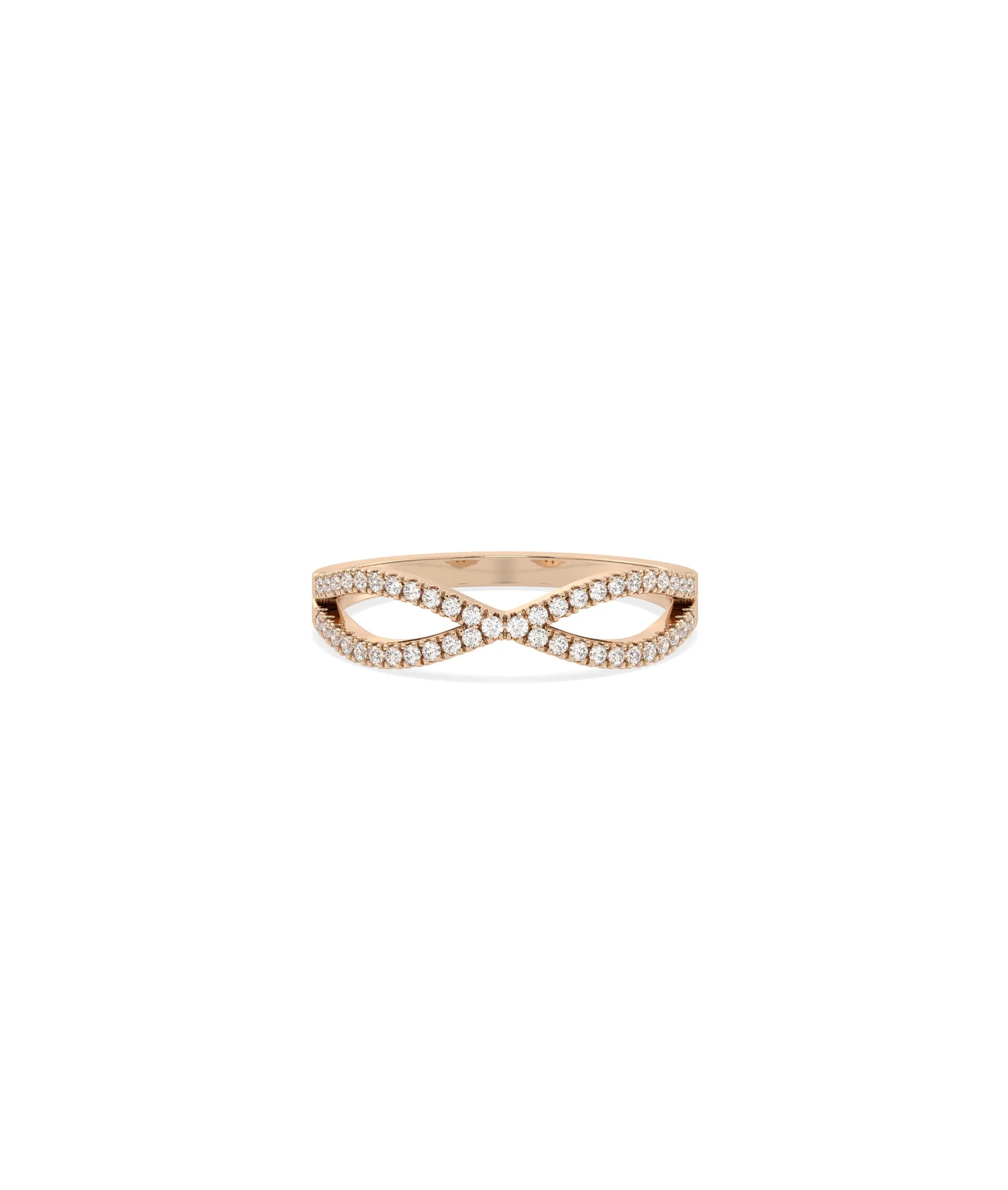 The Criss Cross Diamond Ring features interlocking bands that cross over each other in an X-formation, adorned with diamonds. This geometric design creates dimensional visual interest and contemporary appeal, offering bold styling that distinguishes this piece from traditional straight bands with artistic, architectural movement.