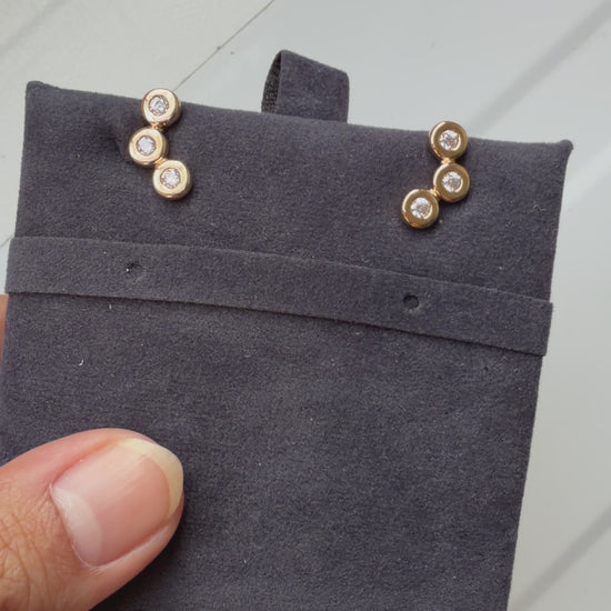 The Bubble Three Stone Chevron Stud Earrings feature three diamonds arranged in a distinctive V-shaped chevron pattern with bubble bezel settings. Crafted in solid gold at approximately 15 mm width, this geometric design offers modern sophistication with secure protection for everyday elegance.