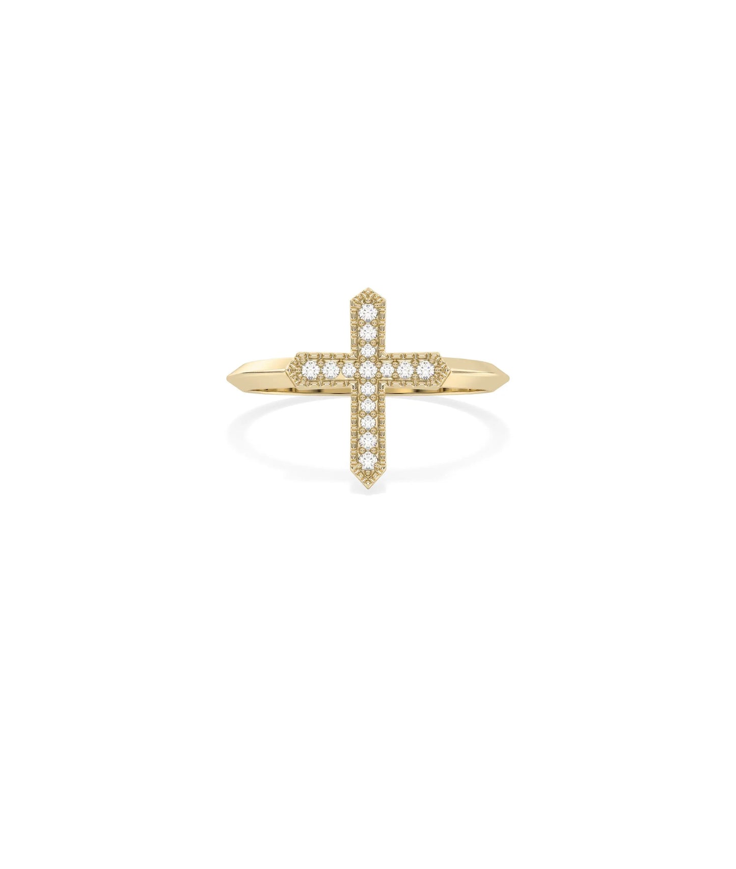 Featuring 0.10 carats of diamonds, this Diamond Cross Ring enhances the sacred cross with beautiful sparkle. The diamonds add elegant brilliance to the spiritual symbol, creating a piece that honors faith with refined beauty and catches light as a shimmering testament to devotion.
