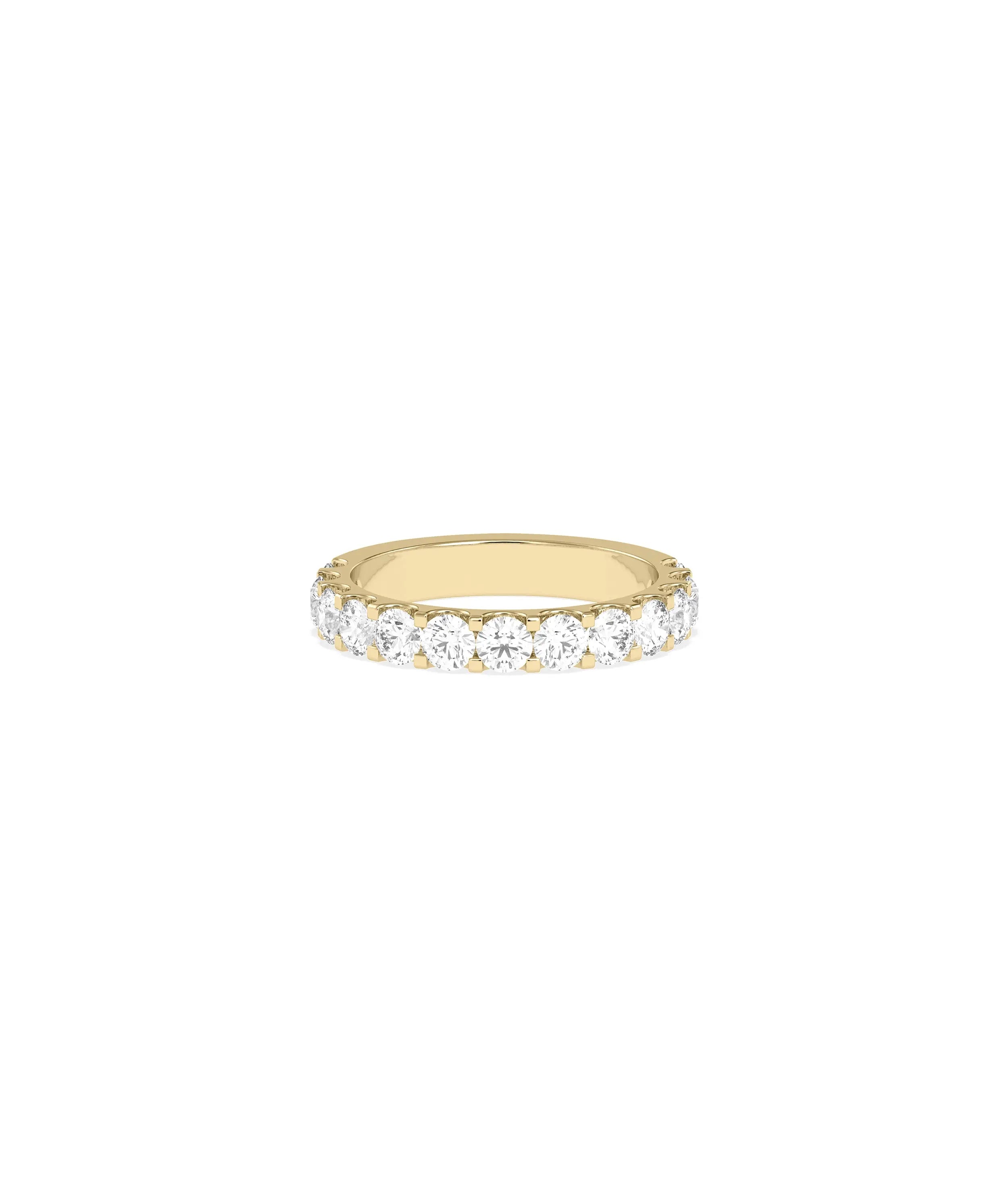 The Diamond Half Eternity Band Ring measures 3.3 mm in band width, creating elegant proportions. This comfortable width showcases the row of diamonds beautifully while remaining practical for everyday wear, stacking, and pairing with engagement rings seamlessly.