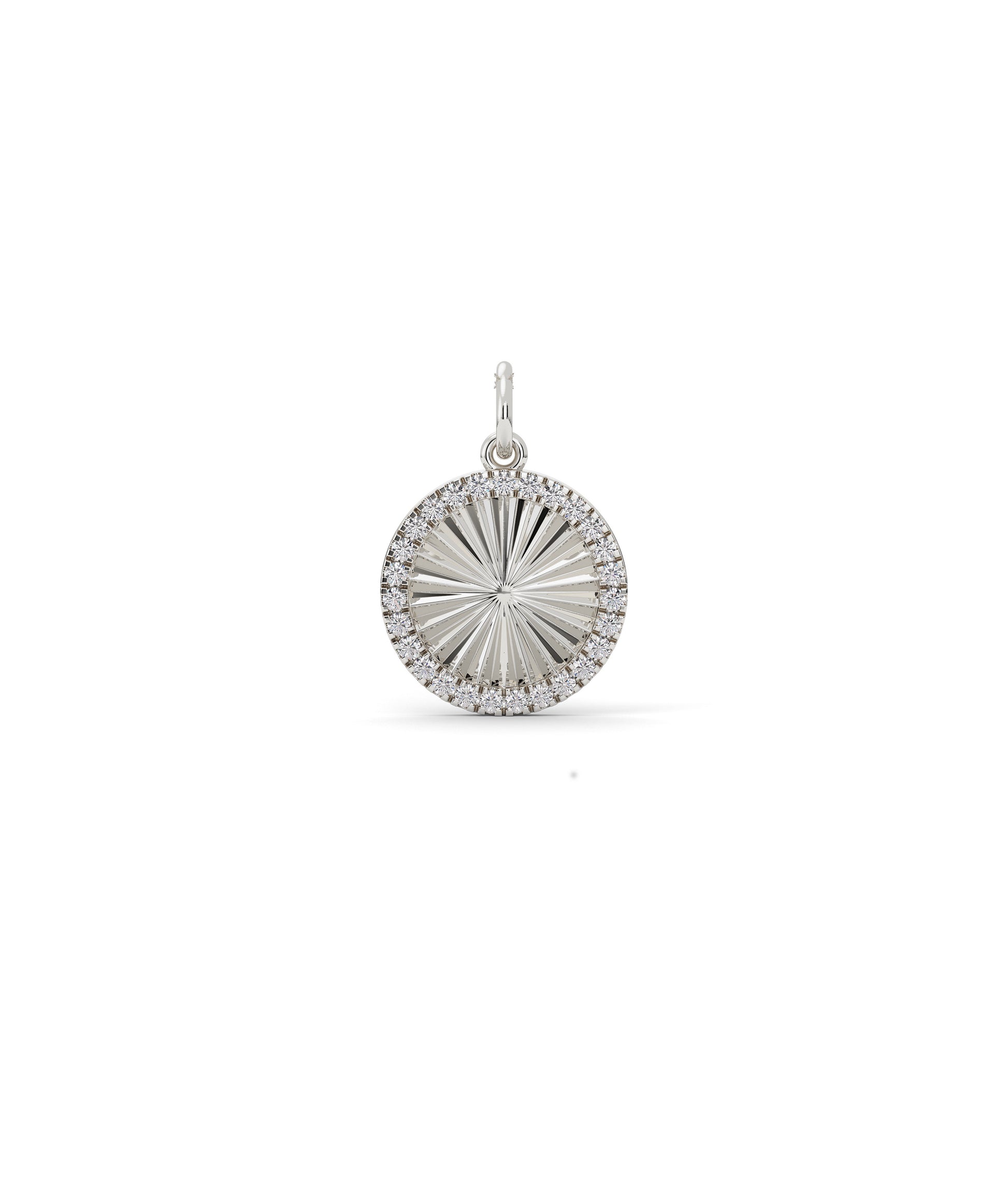 Introducing the Fluted Circle Charm, a stunning piece crafted with quality materials. This pendant features fluted texturing and sparkling diamond accents, adding elegance and timeless style to any outfit with its symbolic circular design.